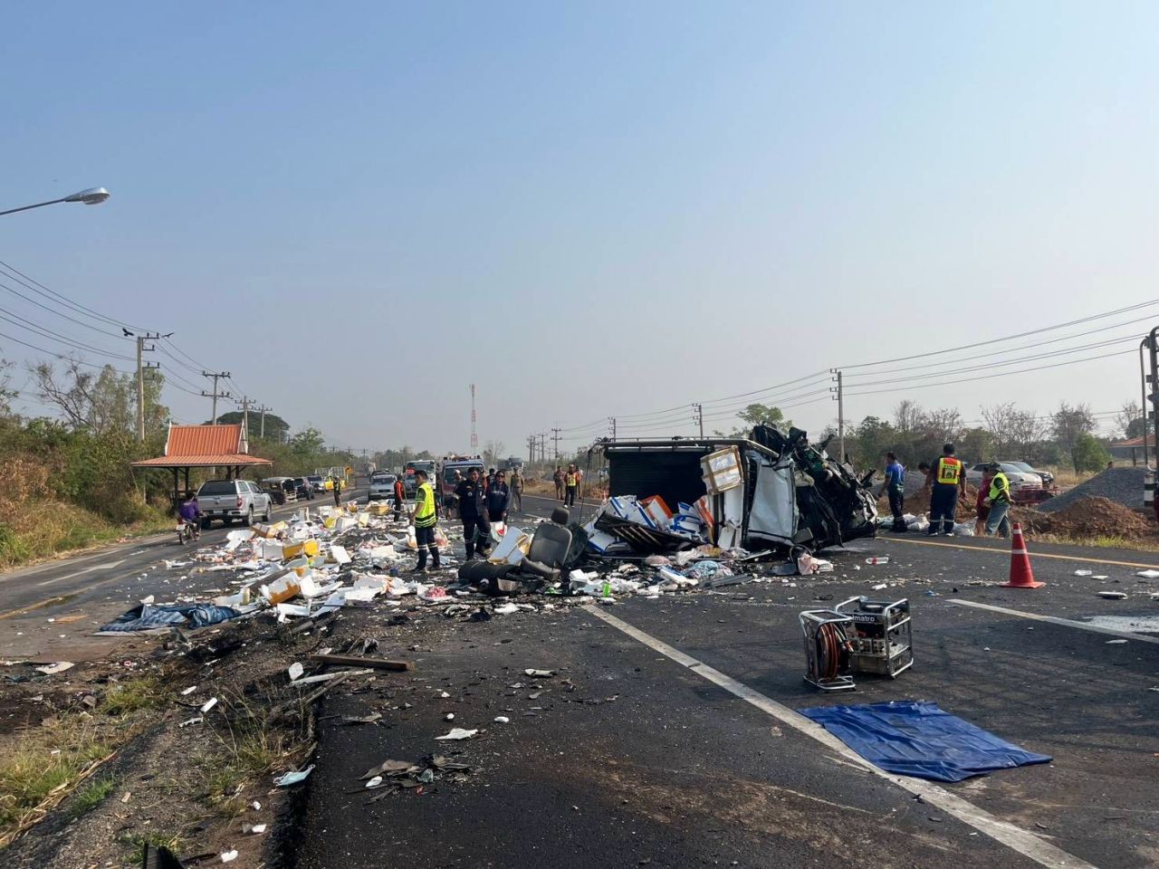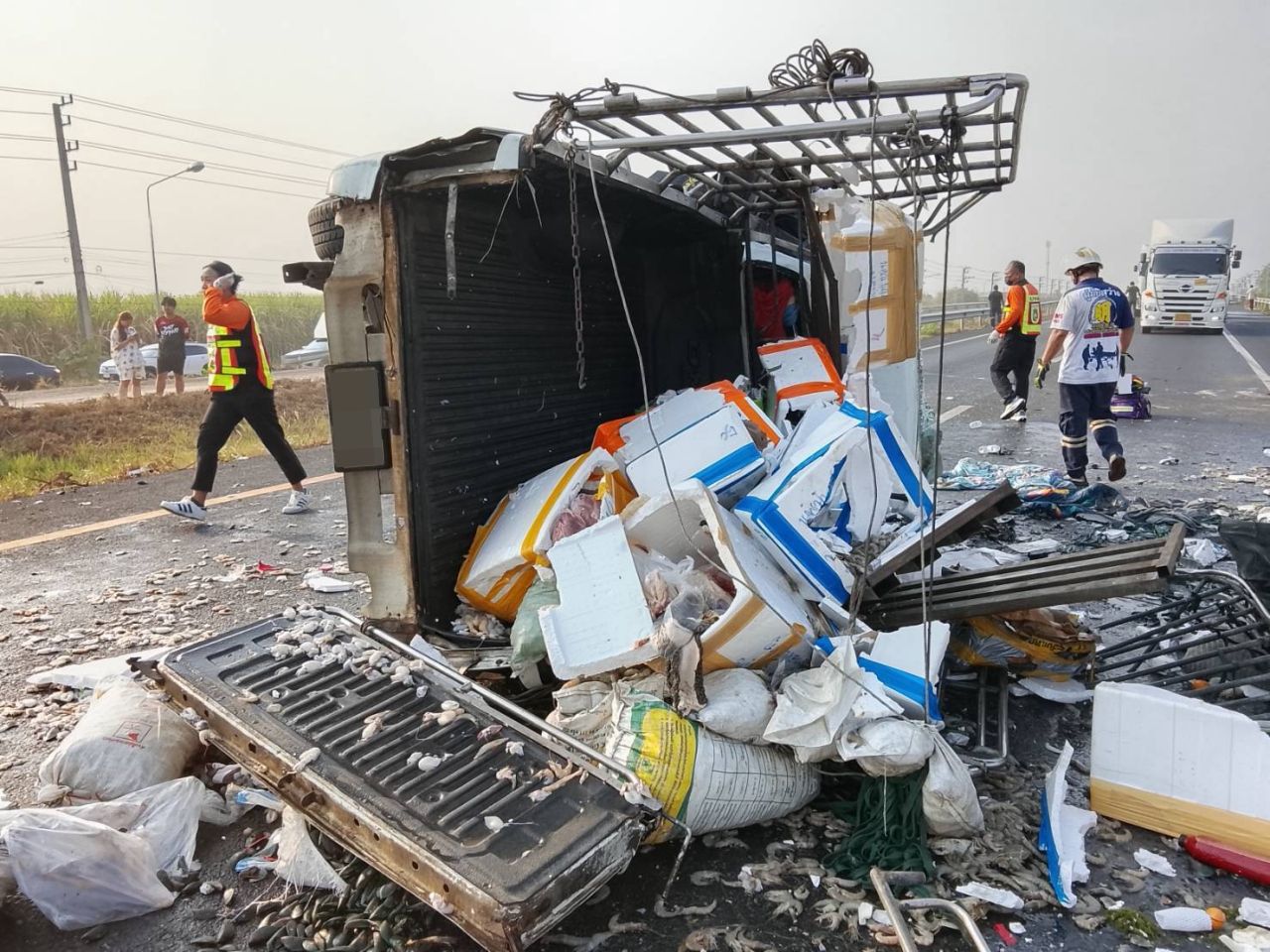 ขณะที่บนถนน พบอาหารทะเล จำพวกปลาหมึก กุ้งทะเล และอื่น ๆ เทกระจัดกระจายเต็มพื้นถนน เจ้าหน้าที่ ชาวบ้านใกล้พื้นที่รีบเข้าช่วยเก็บอาหารทะเลต่าง ๆ ออกจากผิวจราจร หวั่นเกิดอุบัติเหตุซ้ำซ้อน