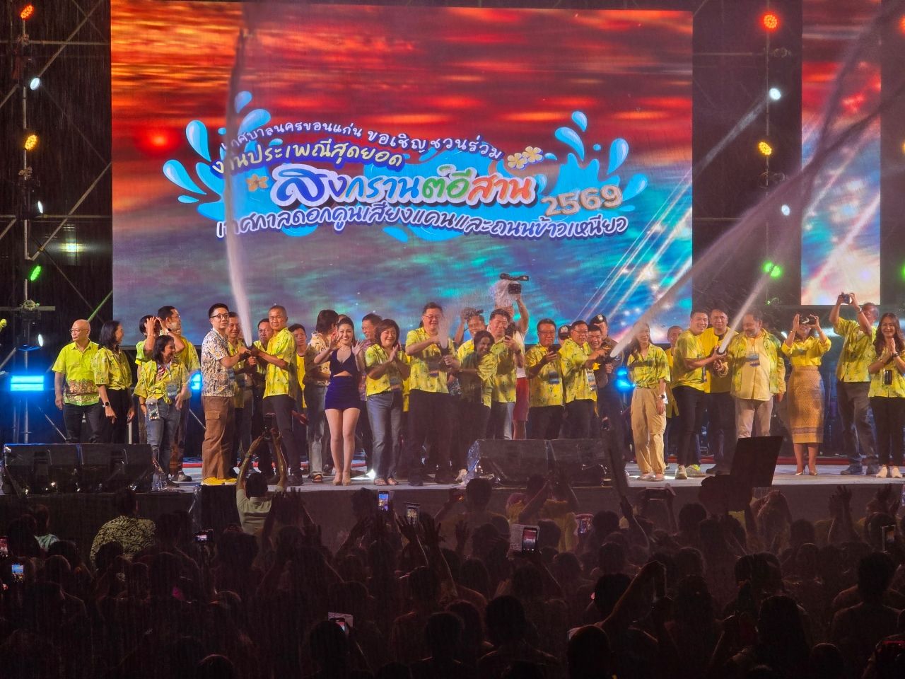 เมื่อเวลา 19.00 น. วันที่ 13 เมษายน 2569 ณ บริเวณถนนข้าวเหนียว ถนนศรีจันทร์ เขตเทศบาลนครขอนแก่น นายขจรเกียรติ รักพานิชมณี ผู้ว่าราชการจังหวัดขอนแก่น พร้อมด้วย นายยุทธพร พิรุณสาร รองผู้ว่าราชการจังหวัดขอนแก่น และนายประสิทธิ์ ทองแท่งไทย นายกเทศมนตรีนครขอนแก่น ร่วมเป็นประธานเปิดกิจกรรม "คลื่นมนุษย์" ในงานประเพณีสุดยอดสงกรานต์อีสาน เทศกาลดอกคูณเสียงแคน และถนนข้าวเหนียว ประจำปี 2569