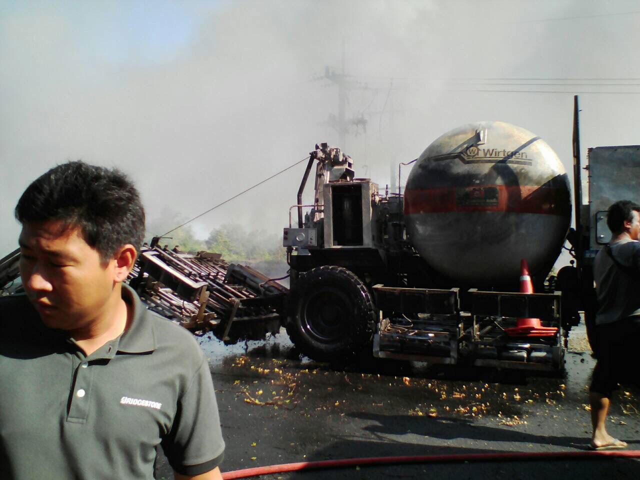 จากการตรวจสอบ ทราบว่า ที่เกิดเหตุเป็นสถานที่ก่อสร้างปรับปรุงผิวถนนราดยาง ระหว่าง กม.135+550-กท.138+600 ทางหลวงหมายเลข 23 ตอนร้อยเอ็ด-เสลภูมิ ของแขวงทางหลวงร้อยเอ็ด มี หจก.พี.ที.ที.เป็นผู้รับ ก่อนเกิดเหตุรถบรรทุกแก๊สได้นำแก๊สแอลพีจีไปเติมให้รถบดอัดถนน แต่สายแก๊สเกิดรั่วแล้วมีประกายไฟ ก่อนจะเกิดระเบิดขึ้น ทั้งคนขับรถและคนงานรีบวิ่งหนีเอาตัวรอด จึงไม่มีใครได้รับอันตราย ส่วนรถ 3 คัน เป็นรถบรรทุกแก๊สแอลพีจี 1 คัน รถบดอัด 2 คัน ของบริษัทรับเหมาก่อสร้าง ถูกไฟไหม้เสียหายหมด เหลือแต่ซาก นอกจากนี้ยังมีเสาไฟฟ้า สายไฟ และบ้านเรือนประชาชนได้ผลกระทบจากแรงระเบิดอีก 1 หลัง ประมาณความเสียหายในเบื้องต้น กว่า 40 ล้านบาท.
