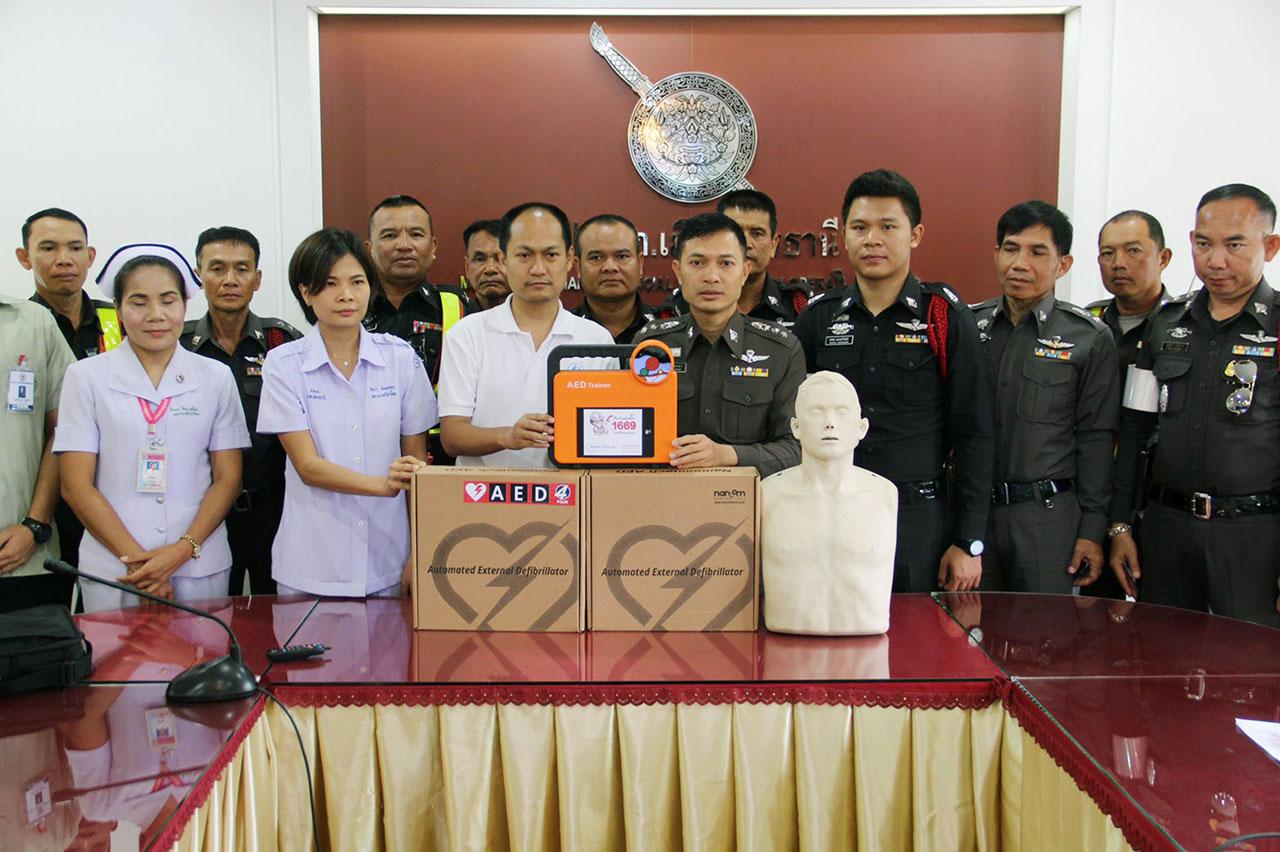ต่อมาเวลา 10.00 น. วันที่ 24 มิถุนายน ที่ศูนย์ปฏิบัติการ สภ.เมืองอุดรธานี นายวีระกิจ อัครโชติวิทย์ แอดมินเพจ Street Hero Project ผู้จัดการบริษัท บีเมท เซนเตอร์ จำกัด จ.นนทบุรี พร้อมคณะ เดินทางมามอบเครื่องกระตุกหัวใจไฟฟ้าอัตโนมัติ หรือ AED จำนวน 2 เครื่อง พร้อมด้วยชุดฝึก 1 ชุด รวมราคา 3 แสนบาท โดยมี พ.ต.อ.ภูมิวิทย์ เวชกามา ผกก.สภ.เมืองอุดรธานี จ.ส.ต.เจริญ จันทร์รักษ์ ผบ.หมู่ จร.สภ.เมืองอุดรธานี และตำรวจจราจร สภ.เมืองอุดรธานี รับมอบ พร้อมกับกล่าวขอบคุณ ผู้ใจบุญที่บริจาคและตัวแทนนำเครื่องมามอบให้ พร้อมกับนำเจ้าหน้าที่กู้ชีพ รพ. การสาธิตและฝึกการใช้เครื่อง AED ให้กับตำรวจจราจร สภ.เมืองอุดรธานีด้วย