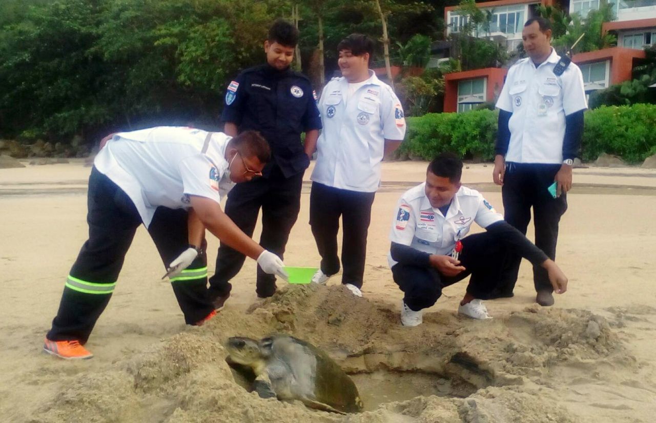 เมื่อเวลา 07.00 น. วันที่ 15 ก.ค. หน่วยกู้ชีพ-กู้ภัย มูลนิธิกุศลธรรมภูเก็ต ประจำพื้นที่หาดป่าตอง อ.กะทู้ ได้รับแจ้งจากชาวบ้านว่า พบเต่าไม่ทราบสายพันธุ์ขึ้นมาเกยตื้นบริเวณชายหาดกมลา หน้าโรงแรมโนโวเทล ภูเก็ต กมลาบีช หมู่ 3 ต.กมลา อ.กะทู้ โดยยังมีชีวิตอยู่ จึงประสานกู้ชีพ อบต.กมลาร่วมตรวจสอบ จุดที่พบเป็นชายหาดยาวตลอดแนว พบเต่าน้ำหนักกว่า 40 กก.มีบาดแผลที่บริเวณขาหน้าขวา และขาหลังขวาฉีกขาด แต่อาจเป็นแผลเก่า เบื้องต้นคาดว่า เป็นเต่าหญ้า เพศเมีย โดยชาวบ้านได้ช่วยกันขุดหลุมทรายบริเวณชายหาดให้มีน้ำทะเลเอ่อขึ้นมาจากพื้นทราย จากนั้นหน่วยกู้ภัยนำเต่าตัวดังกล่าวส่งไปยังศูนย์วิจัยและพัฒนาทรัพยากรทางทะเลและชายฝั่งทะเลอันดามัน ต.วิชิต อ.เมือง จ.ภูเก็ต เพื่อให้สัตวแพทย์ตรวจร่างกายว่ามีความพร้อมที่จะวางไข่หรือไม่อย่างไร และรักษาบาดแผลที่พบตามร่างกายต่อไป.