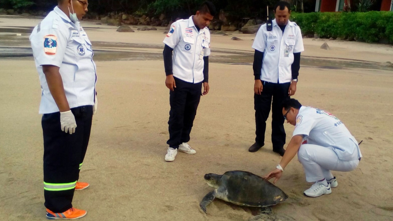 'เต่าหญ้า' หนัก 40 กก. คลานขึ้นจากทะเลริมหาดกมลา จ.ภูเก็ต คาด อาจขึ้นมาวางไข่-มีบาดแผล กู้ภัยภูเก็ต ส่งสัตวแพทย์เยียวยา