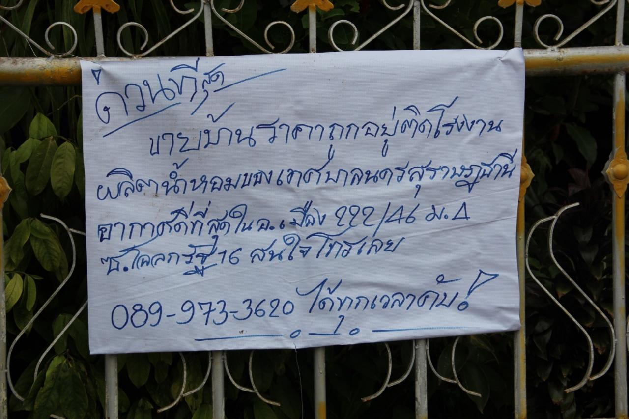 วันที่ 26 ก.ค.60 ผู้สื่อข่าวรายงานว่า ชาวบ้านชุมชนโฉลกรัฐ 16 เขตเทศบาลนครสุราษฎร์ธานี ได้ติดป้ายประกาศขายบ้านพักราคาถูก โดยมีข้อความว่า “ขายบ้านราคาถูกอยู่ติดโรงงานผลิตน้ำหอมของเทศบาลนครสุราษฎร์ธานี อากาศดีที่สุดในอำเภอเมือง 222/46 หมู่ 4 ซ.โฉลกรัฐ 16 สนใจโทรเลย 08-9973-3620 ได้ทุกเวลาคับ”