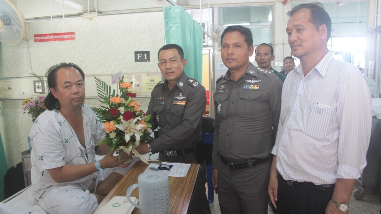 เมื่อวันที่ 28 ก.ค. 60 พล.ต.ต.สนธิชัย อาวัฒนกุลเทพ ผบก.ภ.จว.ชุมพร พร้อมด้วย พ.ต.อ.ไพศาล สังข์เทพ ผกก.สภ.ปากน้ำชุมพร นำกระเช้าดอกไม้เข้าเยี่ยม นายณัฐทัตต์ วงศ์ทองเหลือ อายุ 47 ปี ชาวปทุมธานี นักดำน้ำหนึ่งในผู้รอดชีวิตจากกรณีเรือนำเที่ยวล่มที่บริเวณเกาะง่ามใหญ่ ต.ปากน้ำ อ.เมืองชุมพร ขณะนอนพักรักษาตัวอยู่ที่ รพ.ปากน้ำชุมพร โดย พล.ต.ต.สนธิชัย สอบถามอาการบาดเจ็บซึ่งขณะนี้ปลอดภัยแล้ว แต่แพทย์ให้นอนรอดูอาการ