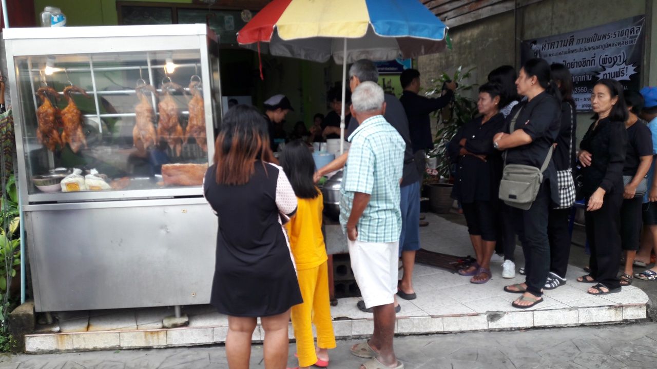 เวลา 07.00 น.วันที่ 13 ต.ค.60 ผู้สื่อข่าวรายงานว่า นายวิพล กระจ่างแสง และนางจิราพร กระจ่างแสง สองสามีภรรยาเจ้าของร้านเป็ดย่างชิกกี่พังงา ตั้งอยู่ตรงข้าม โรงพยาบาลพังงา เขตเทศบาลเมืองพังงา เปิดให้ลูกค้ากินฟรี ตั้งแต่เวลา 07.00-15.00 น. หรือจนกว่าของหมดร้าน เพื่อทำความดีถวายเป็นพระราชกุศล แด่พระบาทสมเด็จพระปรมินทรมหาภูมิพลอดุลยเดช โดยมีคนมารอคิวยาวเหยียด