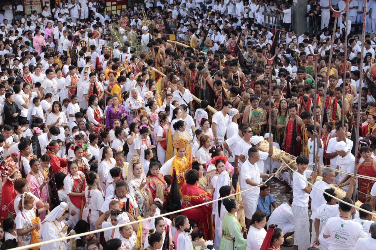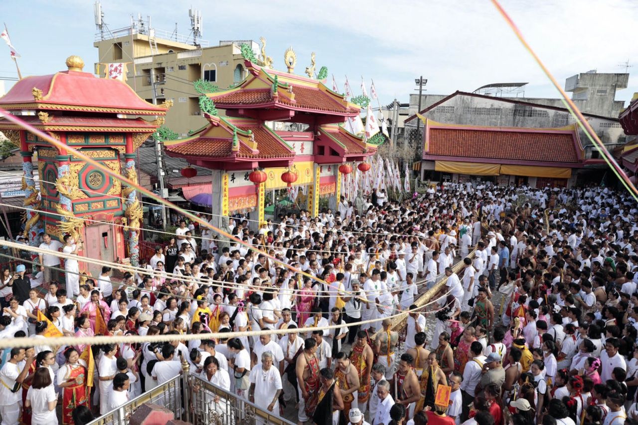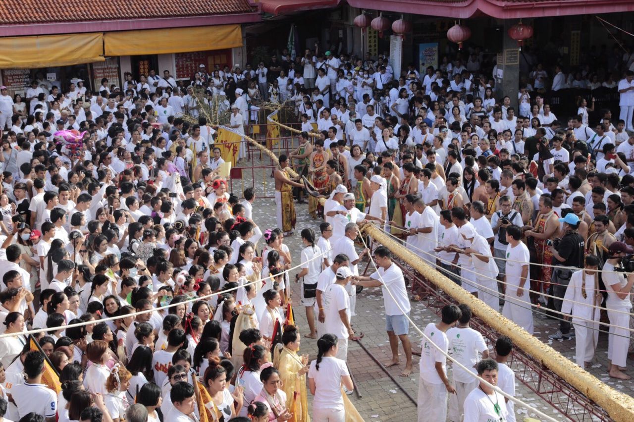 ศาลเจ้าในจังหวัดภูเก็ต ประกอบพิธียกเสาโกเต้ง อัญเชิญตะเกียงเทวดาทั้ง 9 สู่ยอดเสา สัญลักษณ์ของประเพณีถือศีลกินผัก หรือ ”เจี๊ยะฉ่าย” แล้ว คนนับพันเข้าร่วมสืบสวนประเพณีอย่างยิ่งใหญ่ ย้ำ ปีนี้งดพิธีใช้อาวุธทิ่มแทง เหล่าม้าทรง