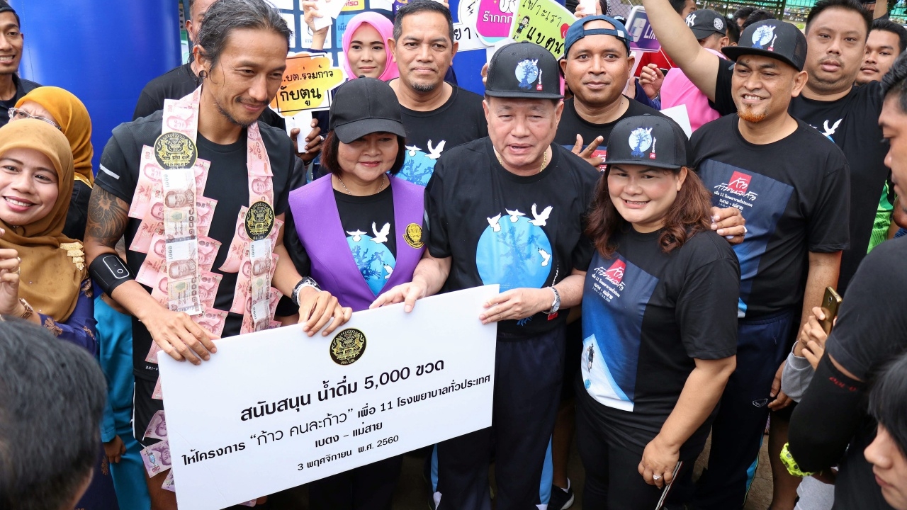 ต่อมา นายยู่สิน จินตภากร ตัวแทนนายกเทศมนตรีนครยะลา เป็นตัวแทนมอบเงินบริจาคที่ได้รับบริจาคจากประชาชนชาวเมืองยะลา ร่วม 4 แสนบาท ให้กับตูน บอดี้สแลม เพื่อสมทบกิจกรรมวิ่งคนละก้าวในครั้งนี้