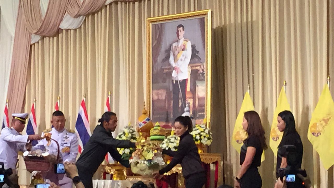 สมเด็จพระเจ้าอยู่หัว โปรดเกล้าฯ ให้ พล.อ.ท.ภักดี แสง-ชูโต ผู้ช่วยราชเลขานุการในพระองค์ เชิญสิ่งของพระราชทานเป็นเครื่องดื่มบำรุงร่างกาย ขนมไทยจากห้องเครื่อง ดอกไม้ มอบให้ตูน และคณะ ที่โรงแรมบรรจงบุรี จ.สุราษฎร์ธานี...