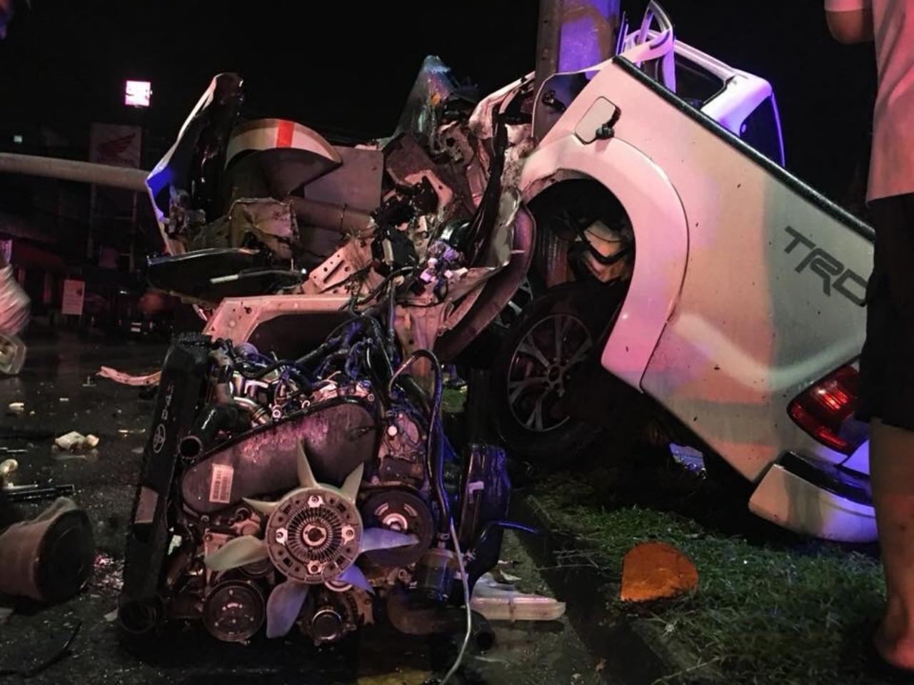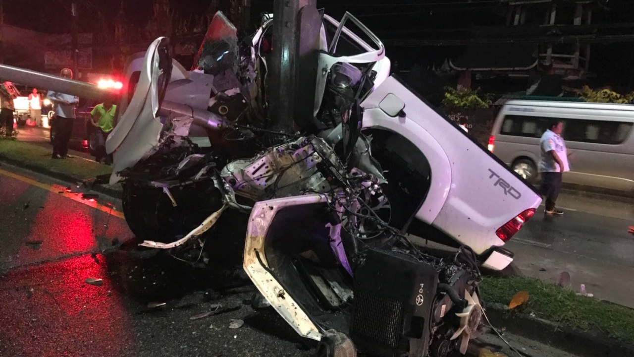 ที่บริเวณเกาะกลาง พบรถยนต์กระบะสี่ประตู ยี่ห้อโตโยต้า รุ่นวีโก้ สีขาว ป้ายทะเบียน กย 7444 ภูเก็ต สภาพรถอัดก๊อบปี้กับเสาไฟฟ้าแสงสว่างกลางถนน รถพังยับเยิน เครื่องยนต์หลุดออกมาตั้งกองกับพื้นที่ถนน เห็นเจ้าหน้าที่กำลังใช้เครื่องตัดถ่างช่วยเหลือ นายชาตรี ทองจิตต์ อายุ 31 ปี อยู่บ้านเลขที่ 114 ม.3 ต.ไม้ขาว อ.ถลาง จ.ภูเก็ต เป็นผู้ขับขี่ ออกมาช่วยเหลือปฐมพยาบาลเบื้องต้นแต่ไม่สามารถช่วยเหลือได้เสียชีวิตเวลาต่อมา และเจ้าหน้าที่ฯ อีกชุดกำลังให้การช่วยเหลือ นางสาวธันยพร อุ่นใหม่ คนนั่งข้างช่วยเหลือมาได้นำส่งโรงพยาบาลถลางเพื่อให้แพทย์ช่วยเหลืออย่างเร่งด่วน และนำศพผู้เสียชีวิตส่งโรงพยาบาลถลางต่อไป
