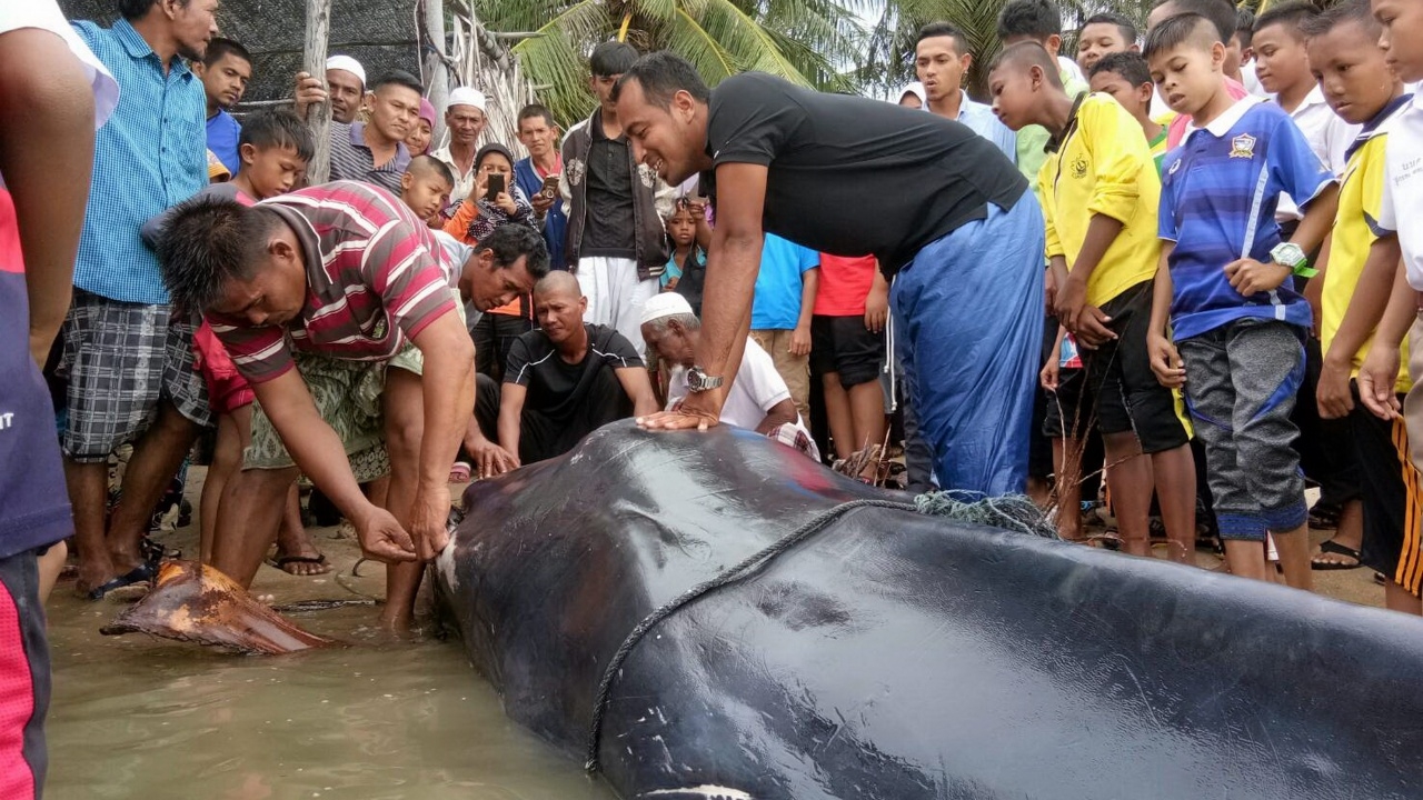 วาฬเกยตื้นตัวใหญ่ ยาวกว่า 7 เมตร กระเสือกกระสนหายใจรวยรินอยู่ชายหาด อ.ยะหริ่ง จ.ปัตตานี ชาวบ้านช่วยกันทั้งลากลงน้ำลึก ตักน้ำราดให้หายใจ แต่สุดท้ายตาย คาดเจอน้ำเปลี่ยนช่วงมรสุม...