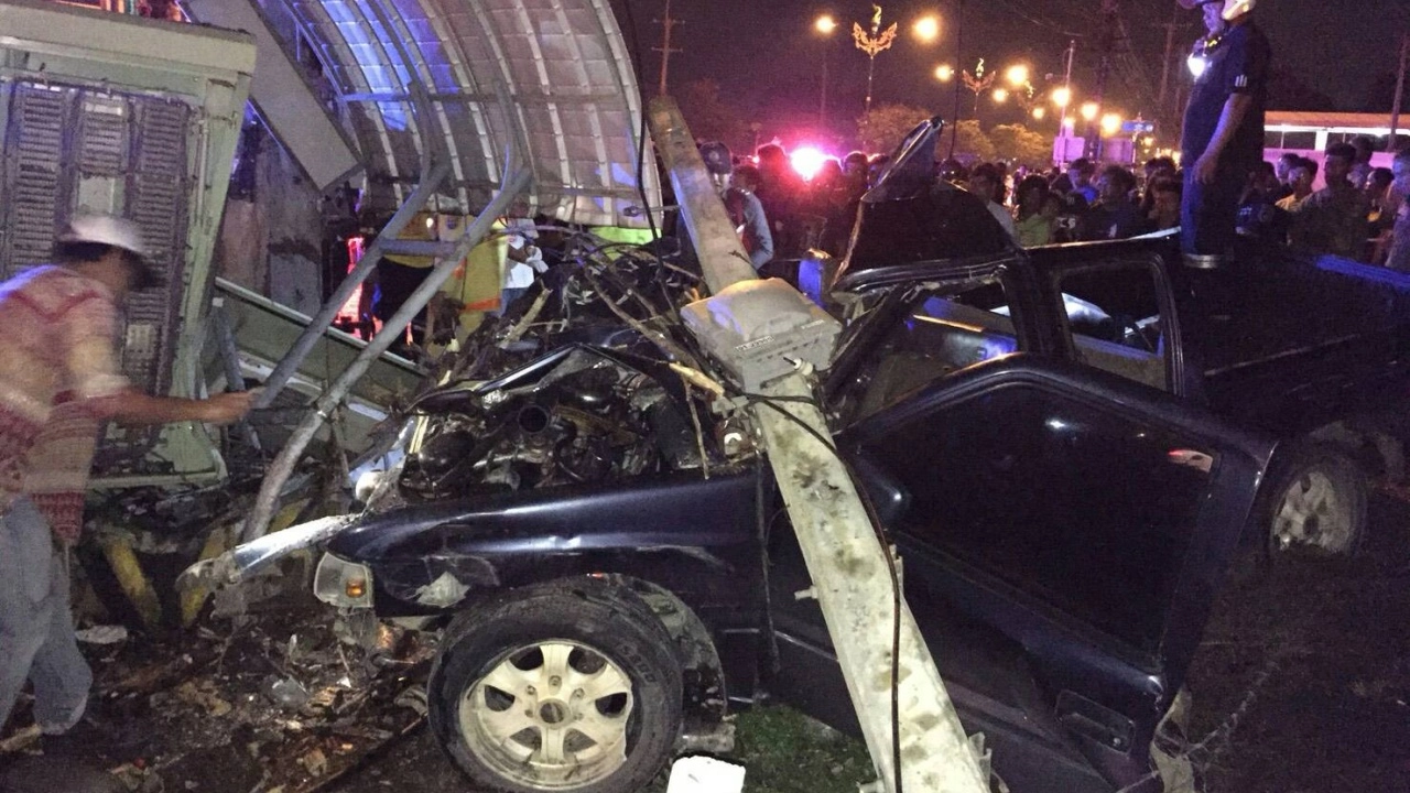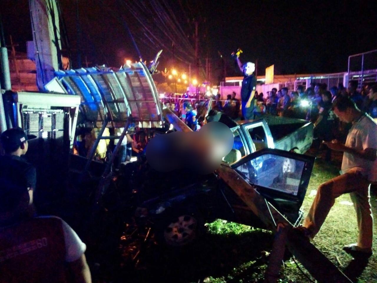 กระบะเมืองคอนซิ่งแข่งท้านรกกลางเมือง เจอ จยย.ตัดหน้า เบรกสะบัดชนคู่กรณีเสียหลักพุ่งชนศาลาริมทาง ตู้หม้อแปลงไฟ วินาศสันตะโรดับสยอง 2 ศพ เจ็บสาหัสอีก 1 ราย...