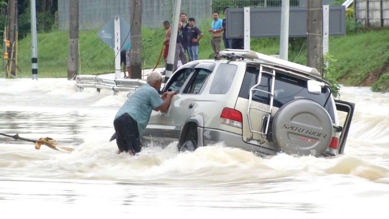 ระหว่างนั้นได้มีรถยนต์โตโยต้า รุ่นสปอร์ต ไรเดอร์ สีบรอนซ์ทอง ทะเบียน กจ 6575 ตรัง มากันทั้งครอบครับ มีเด็กเล็ก 4 คน และผู้ใหญ่อีก 3 คนทั้งหมดเป็นญาตินั่งมาในรถด้วยกัน เมื่อขับมาถึงช่วงกลางถนนที่ น้ำท่วมเกิดเสียหลักถูกกระแสน้ำเชี่ยวซัดไปตกริมไหล่ทาง เดชะบุญชาวบ้านเห็นเหตุการณ์รีบลงไปช่วย ก่อนนำเชือกไปผูกกับรถตักที่มาซ่อมถนนลากขึ้นมา โดยพยายามนำเด็กทะยอยออกมาอย่างทุลักทุเลทุกคนปลอดภัย