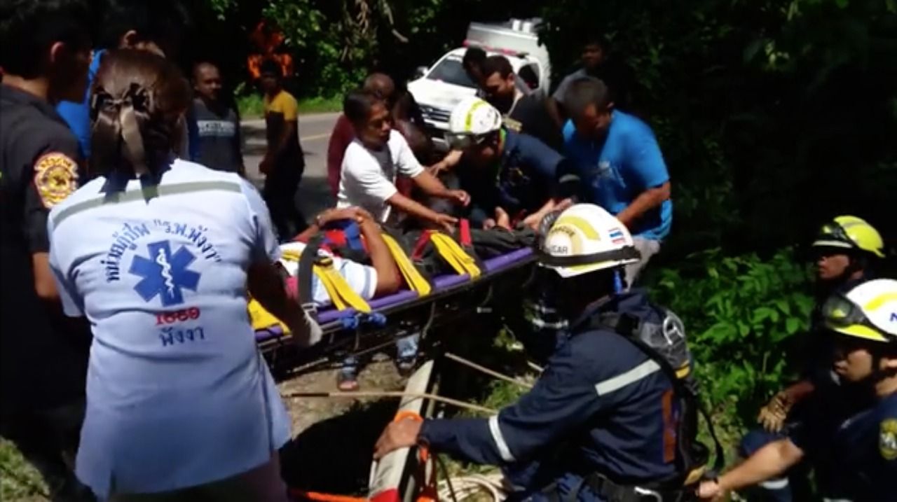 เมื่อวันที่ 10 ธ.ค.2560 เจ้าหน้าที่ป้องกันบรรเทาสาธารณภัย พร้อมด้วย ตำรวจ สภ.ทุ่งคาโงก แพทย์ พยาบาล โรงพยาบาลพังงา หน่วยกู้ภัยโพธิธรรมประภาส ใช้เชือกโรยตัวจากไหล่ทางริมถนนเขานางหงส์ เข้าช่วยเหลือผู้บาดเจ็บที่ติดอยู่ในรถยนต์อีซูซุ มิวเซเว่น สีขาว ทะเบียน กข 7407 กระบี่ หลังจากเกิดอุบัติเหตุพุ่งลงข้างทางตกเหวลึกกว่า 70 เมตร บนถนนเขานางหงส์ สายเพชรเกษม ทับปุด-พังงา หลักกิโลเมตรที่ 14 ต.นบปริง อ.เมือง จ.พังงา พบผู้บาดเจ็บจำนวน 4 คน คือ นายสุวัฒน์ชัย หลานไทย อายุ 51 ปี ผู้ใหญ่บ้านหน้าเขา หมู่ 3 ต.หน้าเขา อ.เขาพนม จ.กระบี่ นายประเสริฐ แจ๊ะหมาด อายุ 43 ปี คนขับ อาชีพทำสวนปาล์มน้ำมัน นายวิเชต พูนเพิ่ม อายุ 56 ปี อาชีพทำสวนปาล์มน้ำมัน ชาวบ้าน หมู่ 3 ต.หน้าเขา อ.เขาพนม จ.กระบี่ ได้รับบาดเจ็บ ไหปลาร้าขวาหัก บาดแผลก้นกก และขาขวา และนายศุภโชค พูนเพิ่ม อายุ 30 ปี ชาวบ้าน หมู่ 3 ต.หน้าเขา อ.เขาพนม จ.กระบี่ ทั้งหมดได้รับบาดเจ็บ และมีอาการปลอดภัย นำส่งโรงพยาบาลพังงา เพื่อเข้ารับการรักษา
