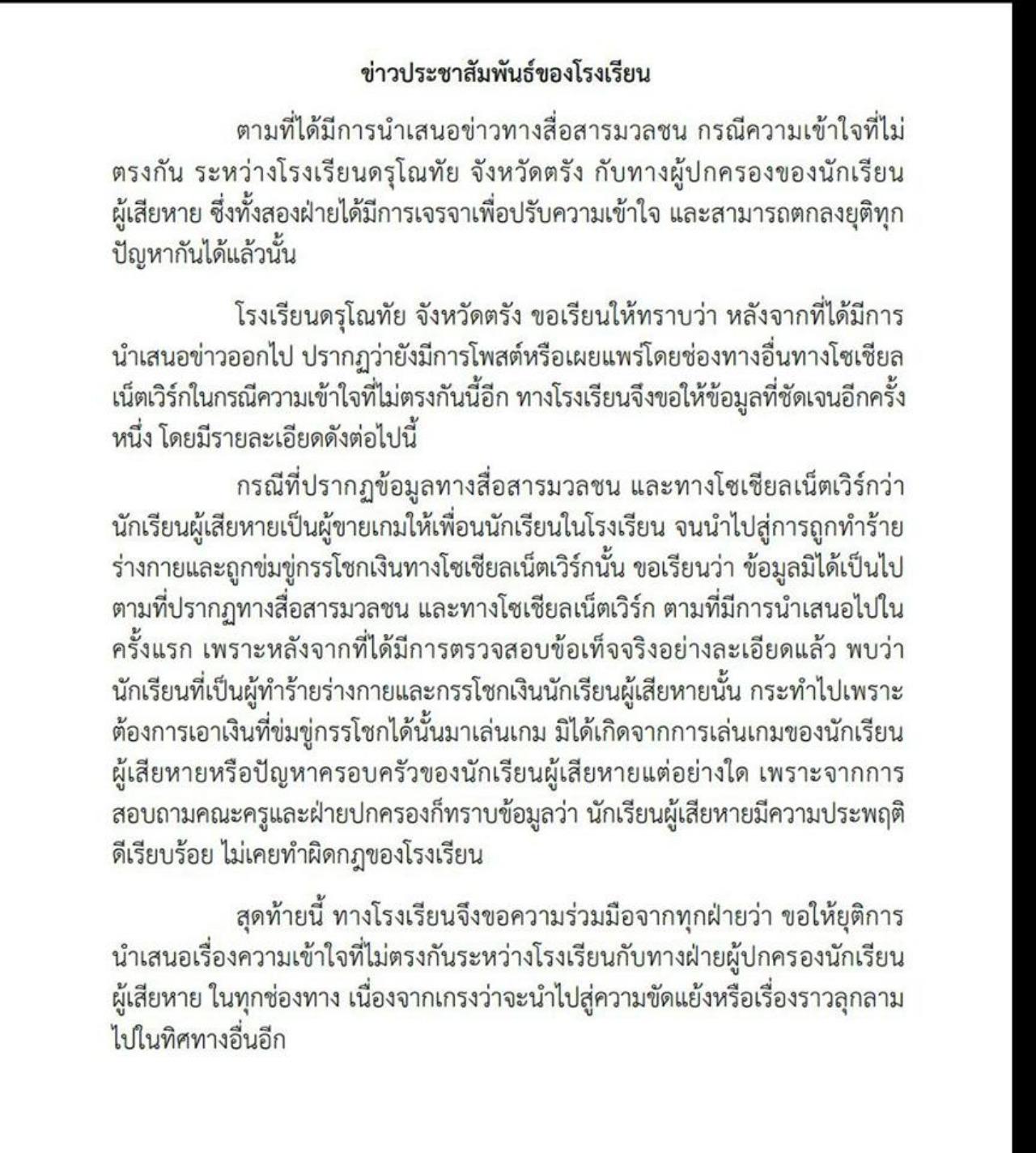แม่เด็ก ม.2 ผู้เสียหายออกมาโพสต์ พร้อมหนังสือประกาศชี้แจงหน้าเว็ปไซต์ของโรงเรียนเอกชนดังว่า ....# ความจริงก็คือความจริง ลูกแม่โดนทำร้ายร่างกายและขู่กรรโชกทรัพย์ทั้งทางวาจาที่โรงเรียนและทางข้อความในแชท หลักฐานและบาดแผลชัดเจน ไม่ได้เกี่ยวอะไรกับเกม...# ทิ้งท้ายเรื่องจบลงแล้ว กรุณาจบ