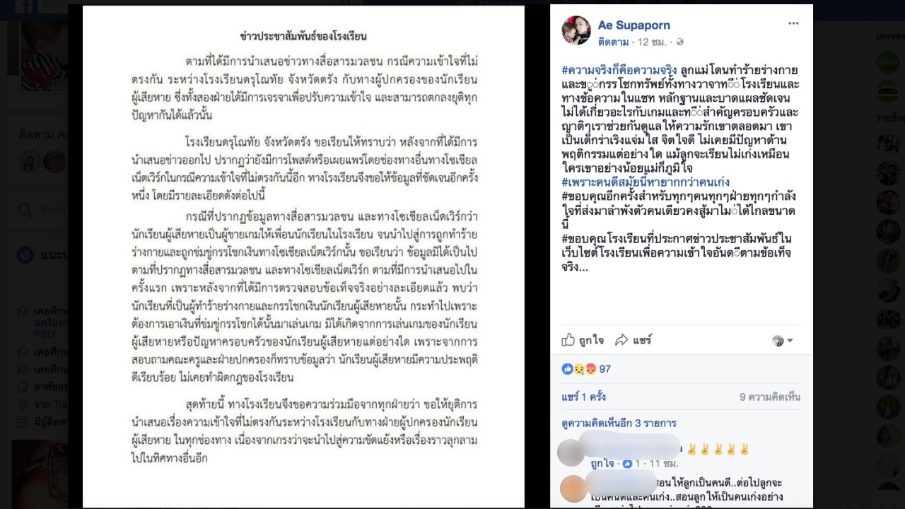 แม่เด็ก ม.2 ผู้เสียหายออกมาโพสต์เฟซบุ๊ก ระบุ ความจริงก็คือความจริงลูกโดนทำร้ายที่โรงเรียน และขู่กรรโชกทั้งทางวางจาและในแชต ไม่มีอะไรเกี่ยวกับเกม เรื่องจบแล้วกรุณาจบ...