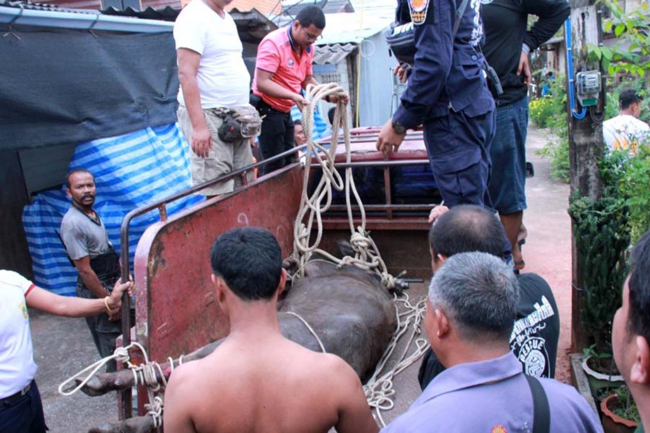 ซึ่งจากการสอบถามชาวบ้านทราบว่าควายตัวดังกล่าวไม่ทราบว่าเป็นของใครและมาจากไหน โดยเริ่มแรกได้วิ่งแตกตื่นเข้ามายังในชุมชน ก่อนที่จะเกิดอาการอาละวาด ไล่ขวิดชาวบ้านที่ขับรถจักรยานยนต์บนถนน ได้รับบาดเจ็บเล็กน้อยจำนวน3 ราย และรถจักรยานยนต์ได้รับความเสียหายเล็กน้อยจำนวน 3 คัน ก่อนที่เจ้าหน้าที่กู้ภัยและประชาชนร่วมจับมัดตัวได้ดังกล่าว