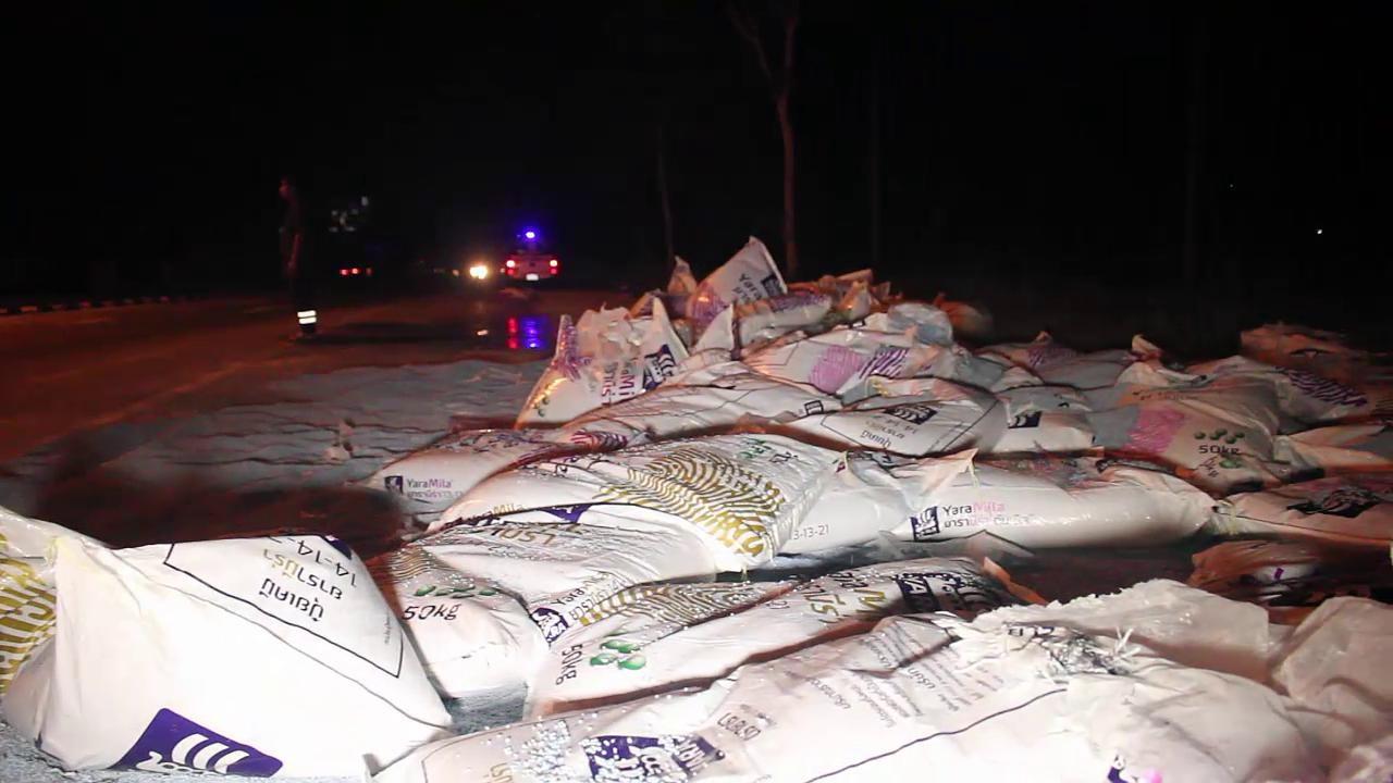 ที่เกิดเหตุพบรถบรรทุก 22 ล้อ ยี่ห้อฮีโน่ สีขาว ทะเบียน 70-3763 ตัวพ่วง ทะเบียน 70-3763 ประจวบคีรีขันธ์ จอดอยู่ไหล่ทางใกล้กันบนพื้นถนนมีกระสอบปุ๋ยตกเกลื่อนเต็มถนนหน่วยกู้ภัยช่วยเก็บออกมาข้างถนนแล้วช่วยกันกวาดทำความสะอาดเม็ดปุ๋ยที่แตกออกจากกระสอบจำนวนมาก ซึ่งโชคดีที่ไม่เกิดอุบัติเหตุกับรถที่ตามมา