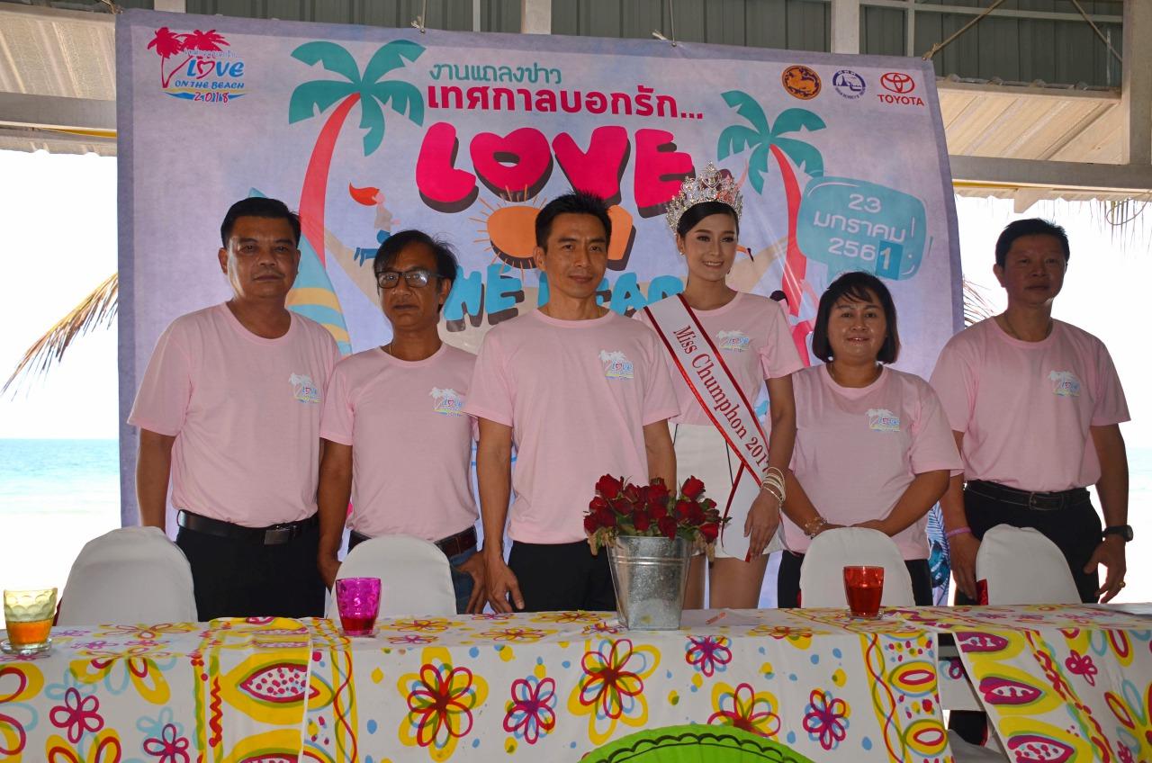 เมื่อวันที่ 24 มกราคม 2561 ที่โรงแรมทะเลใสริมหาดทุ่งวัวแล่น หมู่ 8 ตำบลสะพลี อ.ปะทิว จ.ชุมพร นายธนนท์ พรรพีภาส นายอำเภอปะทิว นางวิริยา แก่นแก้ว ผอ.ททท.สำนักงานชุมพร-ระนอง สิบโทจรัล จันทร์นิตย์ นายก อบต.สะพลี นายอเนก งั่นบุญศรี นายกสมาคมธุรกิจการท่องเที่ยว จ.ชุมพร นายจารึก ดำสันทัด ผจก.บริษัท โตโยต้าชุมพร จำกัด และ น.ส.เจียรนัย สังข์ห้อง หรือ น้องออย นางสาวชุมพร 2017 ร่วมกันแถลงข่าวจัดงาน LOVE ON THE BEACH หรือ “วันบอกรักชายหาด” โดยมีผู้นำชุมชน ผู้ประกอบการร้านอาหาร โรงแรม นักท่องเที่ยว จำนวนมากเข้าร่วมรับฟังการแถลงข่าวดังกล่าว