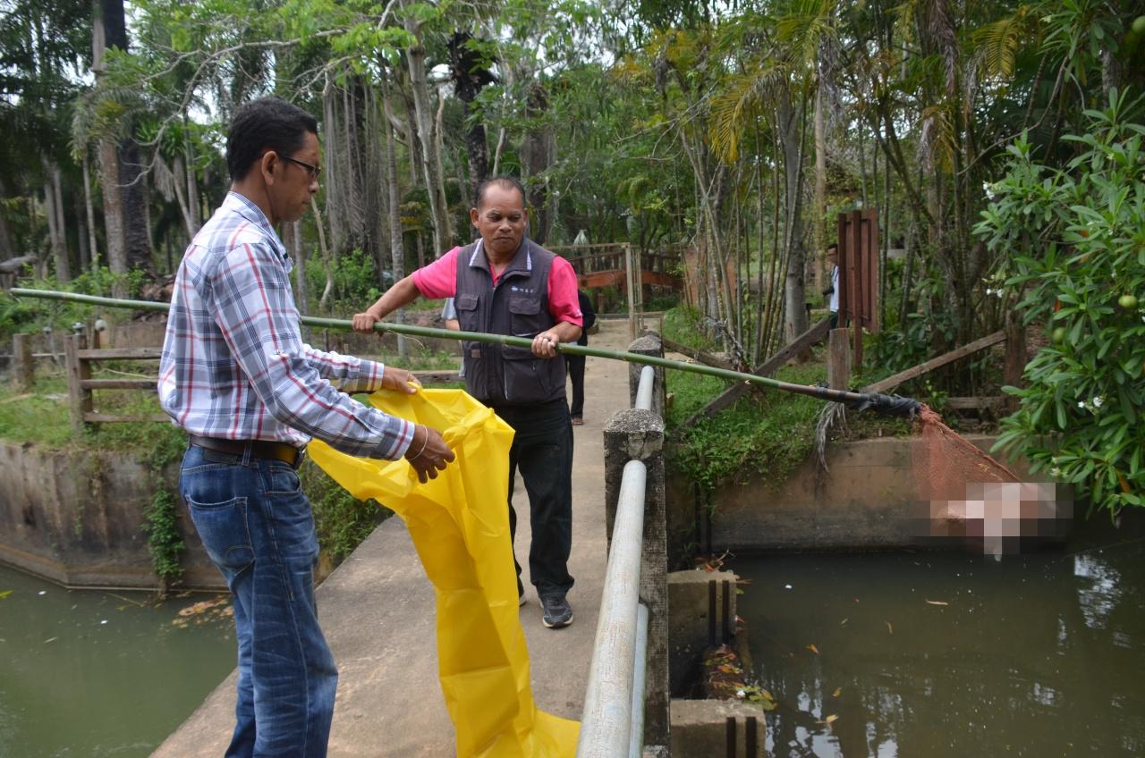 เจ้าหน้าที่ตรวจสอบเป็นซากลูกสุกร ที่ยังมีสายสะดือติดคาอยู่ สภาพเริ่มเน่าเปื่อย จึงใช้สวิงตักลูกสุกรทั้งหมดขึ้นมา แต่ไม่สามารถนำชิ้นเนื้อไปชันสูตรหาเชื้อได้ เนื่องจากเน่าเปื่อยตายมาแล้วไม่ต่ำกว่า 3 วัน จึงนำซากไปขุดหลุมฝังกลบ แล้วใช้น้ำยาฆ่าเชื้อราดทับ เพื่อป้องกันการแพร่ระบาดของเชื้อโรค