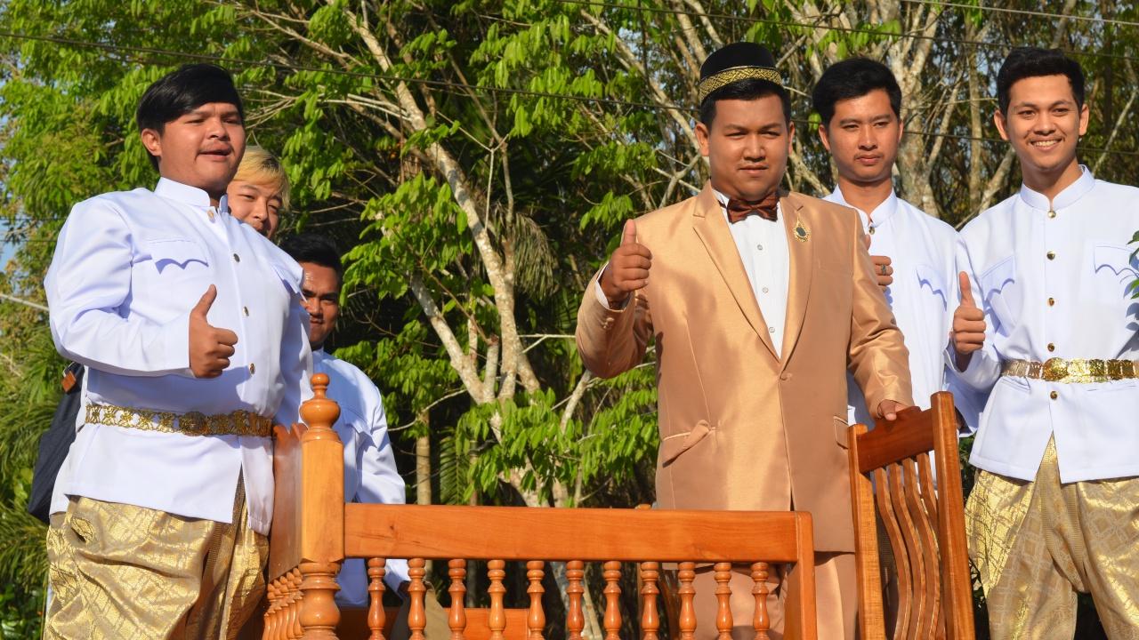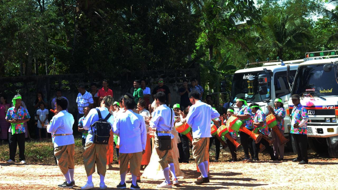ขณะที่บรรยากาศ ระหว่างทางบนถนน สสร้างความฮือฮาให้กับประชาชนที่ขับรถผ่านไปมา ก่อนถึงบ้านเจ้าสาว เป็นระยะทางกว่า 5 กม.โดยทำพิธีแบบฝ่ายเจ้าสาวทำพิธีนิกะฮ์ประเพณีอิสลาม หลังเสร็จพิธีหมั้นและแต่งวางสินสอดทองหมั้น เงินสด จำนวน 5 แสนบาทถ้วน ทองคำรูปพรรณ สร้อยคอ สร้อยข้อมือ หนัก 3 บาท และแหวนเพชร 1 วง หลังเสร็จพิธีได้มีการรำกลองยาวตามประเพณีท้องถิ่นของคนตรังที่ฝ่ายเจ้าบ่าวเตรียมมาเพื่อรับขวัญลูกสะใภ้ โดยมีเพื่อนเจ้าบ่าว เพื่อนฝ่ายเจ้าสาวกว่า 10 คน รวมถึงแขกที่ร่วมร่วมงานได้ร้องรำทำเพลงไปด้วยท่ามกลางบรรยากาศชื่นมื่นและเปี่ยมด้วยความสุข สนุกสนาน