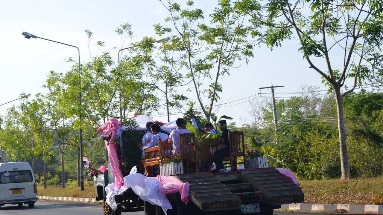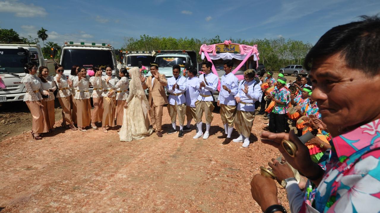 ที่ จ.ตรัง ช่วงเช้าวันที่ 27 ก.พ.61 ที่บ้านแผ่นดินลุม หมู๋ที่ 1 ต.บ้านโพธิ์ อ.เมือง ตรัง นายธีรชัย เขียวจินดา หรือ วีระ บ้านโพธิ์ เจ้าของค่ายมวยวีระ บ้านโพธิ์ และเจ้าของธุรกิจรถบรรทุก รถแบ็คโฮ รายใหญ่ของเมืองตรัง ได้จัดขบวนยกขันหมากให้เจ้าบ่าว นายไพสิฐ หรือแชมป์ เขียวจินดา อายุ 24 ปี ลูกชาย จบการศึกษาระดับ ปวช.แผนกช่างโยธา โดยจัดรถดั้มเก่า แบบโบราณ รุ่นคุณปู่ เจ้าหัวโต และขบวนรถบรรทุกกว่า 10 คัน ต่อแถวเรียงกัน และรถยนต์เก๋ง รถกระบะเป็นแถวยาวร่วม 1 กม. บนถนนสายเลี่ยงเมืองตรัง-ควนปริง เพื่อยกขันหมากไปสู่ขอ ลูกสะใภ้ น.ส.มะลิสา หรือจิ๊ก นิยมเดช อายุ 28 ปี จบการศึกษาระดับปริญญาโท (สาขาการเงิน) จากมหาวิทยาลัยรามคำแหง ทำอาชีพธุรกิจส่วนตัวค้าปลีก-ส่งไก่ชำแหละ หลังจากเมื่อคืนวันที่ 26 ก.พ.ที่ผ่านมา ได้จัดงานเลี้ยงฉลองที่บ้านเจ้าบ่าวอย่างยิ่งใหญ่ ทั้งโต๊ะจีน และวงดรตรี ท่ามกลางแขกเหรื่อที่มาร่วมยินดีกว่า 2 พันคน