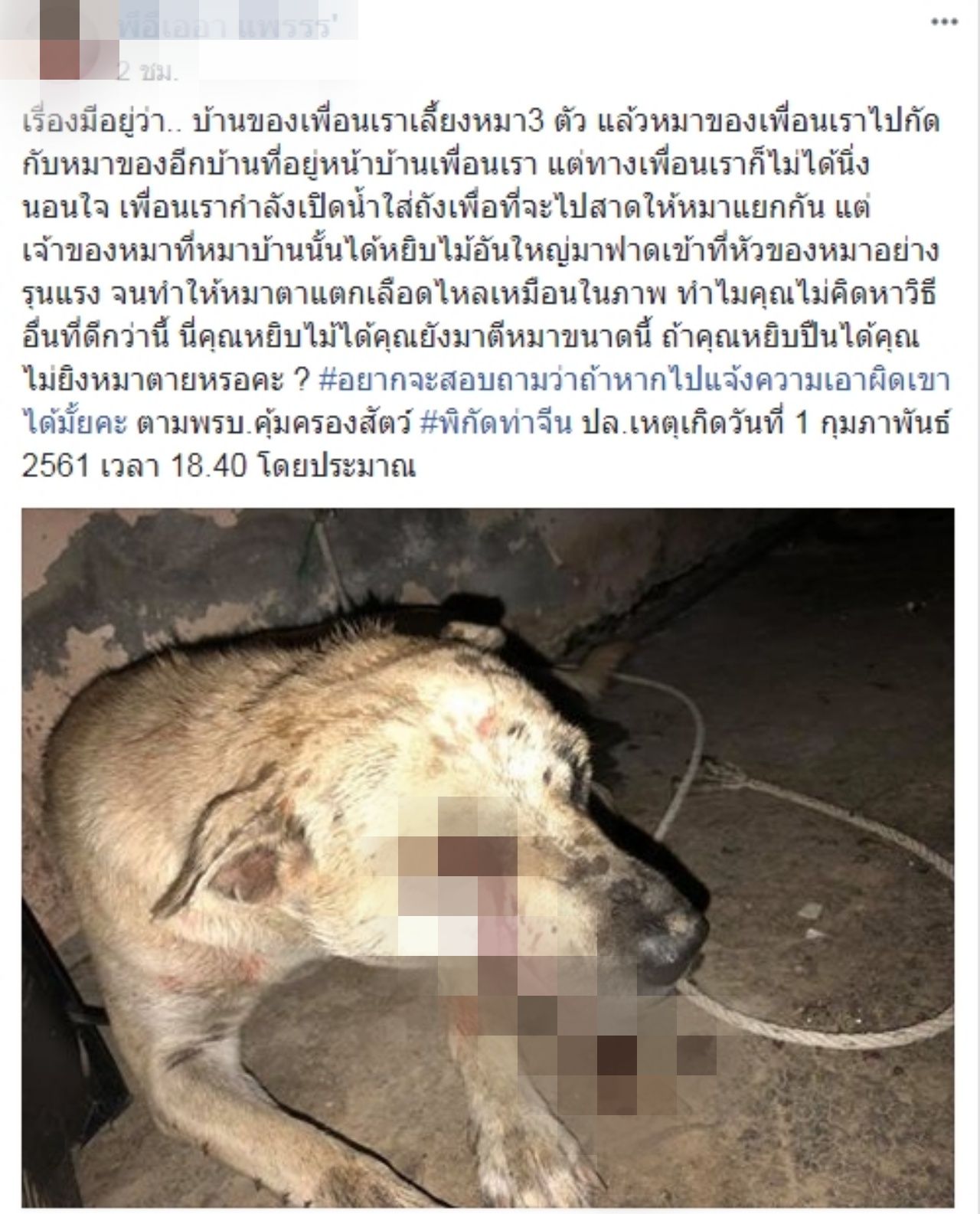 วันที่ 4 มี.ค.61 ผู้สื่อข่าวรายงานว่า ในกลุ่มเฟซบุ๊กคนตรัง มีผู้ใช้ชื่อว่า “พีอีเออา แพรรร'” ได้โพสต์ภาพสุนัข สีน้ำตาล บาดเจ็บมีเลือดไหลออกมาจากตา พร้อมกับเปิดเผยว่า เมื่อเวลา 18.40 น. วันที่ 1 ก.พ.61 ที่ผ่านมา ที่บ้านของเพื่อนตนเอง บริเวณชุมชนท่าจีน ต.บางรัก อ.เมืองตรัง ได้เลี้ยงสุนัขไว้จำนวน 3 ตัว แล้วสุนัขของเพื่อนได้วิ่งไปกัดสุนัขของเพื่อนบ้าน ภายในเขตบ้านของเพื่อนบ้านที่ห่างกันประมาณ 50 เมตร โดยที่ไม่มีการล้อมรั่วกั้นไว้เป็นบริเวณ แต่ทางเพื่อนของตนเองที่เห็นเหตุการณ์ไม่ได้นิ่งนอนใจ จึงได้เปิดน้ำใส่ถังเพื่อที่จะไปสาดใส่สุนัขเพื่อให้แยกออกจากกัน ทันใดนั้นเพื่อนบ้านที่เป็นเจ้าของสุนัข ได้หยิบท่อนไม้อันใหญ่ฟาดเข้าที่ศีรษะสุนัขของเพื่อนตนเองอย่างรุนแรง จนทำให้ตาแตกเลือดสาดไหลออกมาจากดวงตา ทำให้สุนัขของเพื่อนนอนเจ็บปวดทรมาน รีบวิ่งกลับมาที่บ้าน ในสภาพเลือดท่วมใบหน้า