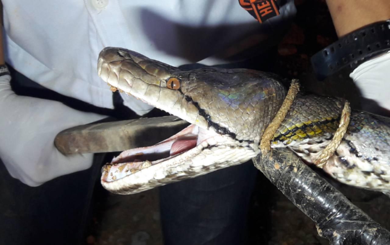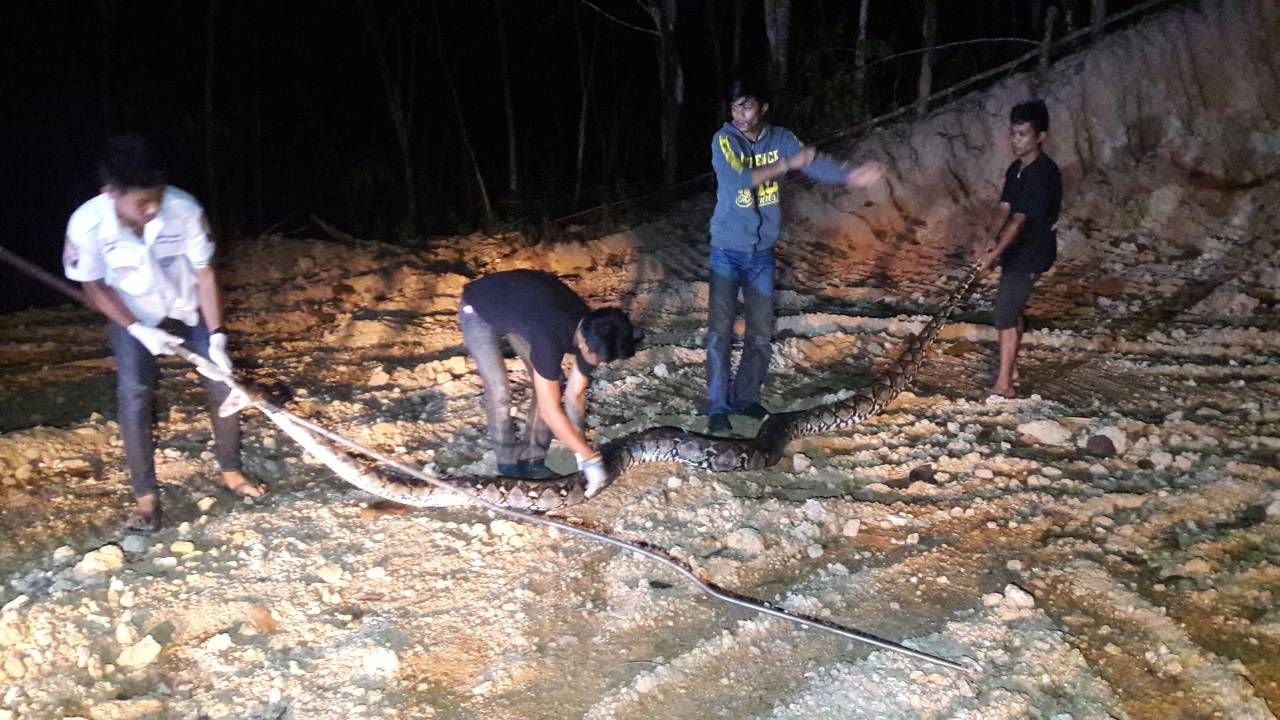 เมื่อไปถึงสวนยางพารา พบงูเหลือมขนาดใหญ่กำลังเลื้อยอย่างช้าๆ อยู่ข้างขอนไม้ เจ้าหน้าที่ไม่รอช้ารีบนำอุปกรณ์เข้าจับงู ก่อนจะช่วยกันดึงตัวงูให้ออกมาอยู่ในที่โล่ง วัดความยาวได้ถึง 4 เมตรเศษ หนักราว 70 กก. พบว่าเป็นงูเหลือมเพศเมีย จากนั้นช่วยกันนำใส่ถุงกระสอบปุ๋ยที่เตรียมมาแทบจะใส่เกือบไม่หมด