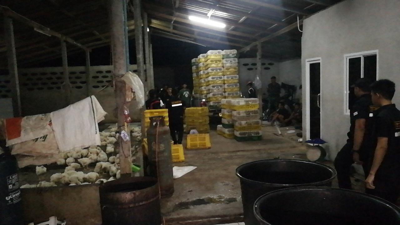 โดยขณะเข้าตรวจค้นเจ้าหน้าที่ได้ปิดล้อมทั้งด้านหน้าและด้านหลังก่อนที่เข้าไปทางด้านหลังพบว่า ภายในโรงเชือดไก่แห่งนี้ มีไก่เป็นที่อยู่ในคอกและที่อยู่ในรถกระบะนับร้อยตัว ที่กำลังรอเชือด พร้อมอุปกรณ์เกี่ยวกับเชือดไก่ ทั้งเครื่องลวก เครื่องปั่นขน และคนงานอีกประมาณ 10 คน ที่กำลังเตรียมเชือดการเชือดไก่ และยังพบน้ำใบกระท่อมที่แช่น้ำแข็งพร้อมดื่มอีก 1 กระติก