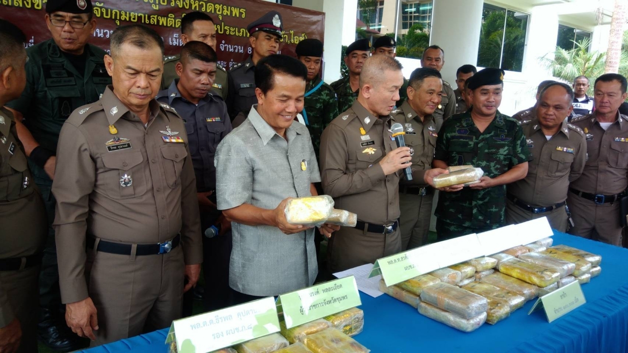 เมื่อเวลา 10.00 น.วันที่ 5 เม.ย.61 ที่หน้าสำนักงานภูธรจังหวัดชุมพร พล.ต.ท.สรศักดิ์ เย็นเปรม ผบช.ภ.8 นายณรงค์ พลละเอียด ผวจ.ชุมพร พ.ท.ภาคิน เกื้อกูล ผบ.ร.25 พัน.1 และเจ้าหน้าที่ทหารชุด ชป.รส.ร.25 พัน.1 มทบ.44 จ.ชุมพร ร่วมกันแถลงข่าวการจับ นายนิฮาฟิช นิแฮ อายุ 22 ปี อยู่บ้านเลขที่ 73/11 หมู่ที่ 1 ต.ศรีสาคร อ.ศรีสาคร จ.นราธิวาส พร้อมของกลาง ยาบ้า ห่อด้วยกระดาษเคลือบเทียนไขสีน้ำตาล มีตัวอักษร Y-1 จำนวน 32 ห่อ ประมาณ 190,000 เม็ด และยาไอซ์ ชนิดเกล็ดใส ห่อด้วยกระดาษสีเหลือง ยี่ห้อ Guanyinwang จำนวน 8 ห่อ น้ำหนักห่อประมาณ 1 กก. รวม 8 กก. และรถเก๋ง ฮอนด้า รุ่นซิตี้ สีเทา ทะเบียน วห 7271 กรุงเทพมหานคร ที่ใช้เป็นพาหนะซุกซ่อนยาเสพติดในครั้งนี้ 1 คัน