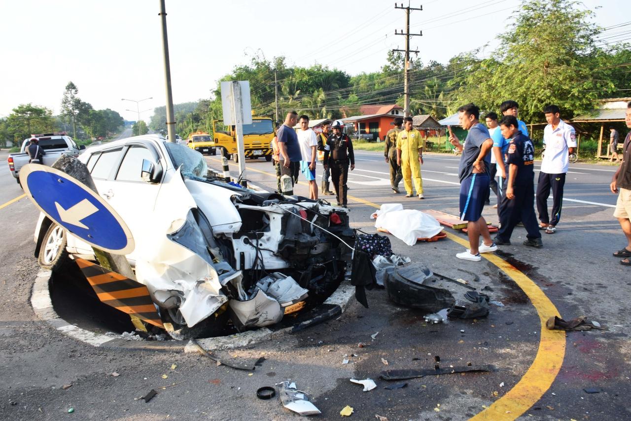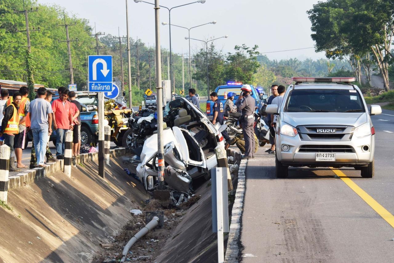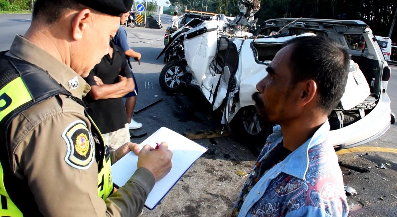 เจ้าหน้าที่ตรวจสอบที่เกิดเหตุพบมีร่องรอยรถเสียหลักไถลครูดถนนลงไปในร่องกลางระหว่างถนนสี่เลน มาจากคอสะพานห้วยป่ง ซึ่งเป็นทางตรงลงเนินก่อนถึงจุดกลับรถที่เกิดเหตุประมาณ 150 เมตร ชนเสาไฟฟ้าส่องสว่างล้มไป 2 ต้น และหลักขาวดำกั้นขอบทางร่องกลางถนนหักอีกหลายต้น เจ้าหน้าที่ได้บันทึกภาพเก็บไว้เป็นหลักฐาน ตำรวจสอบสวน นายจิรัฐ หวันโส้ คนขับรถซึ่งบาดเจ็บเล็กน้อยให้การว่า ผู้บาดเจ็บ 2 คน เป็นพ่อกับลูก และผู้เสียชีวิต 2 ศพ เป็นแม่กับลูก ทั้งหมดเป็นครอบครัวเดียวกัน ประกอบธุรกิจแบบครอบครัวตัดเย็บเสื้อผ้าสำเร็จรูปทั้งขายปลีกและขายส่งอยู่ที่ อ.บางพลี จ.สมุทรปราการ ได้เดินทางกลับมาเยี่ยมญาติที่ จ.นครศรีธรรมราช และท่องเที่ยวช่วงเทศกาลสงกรานต์