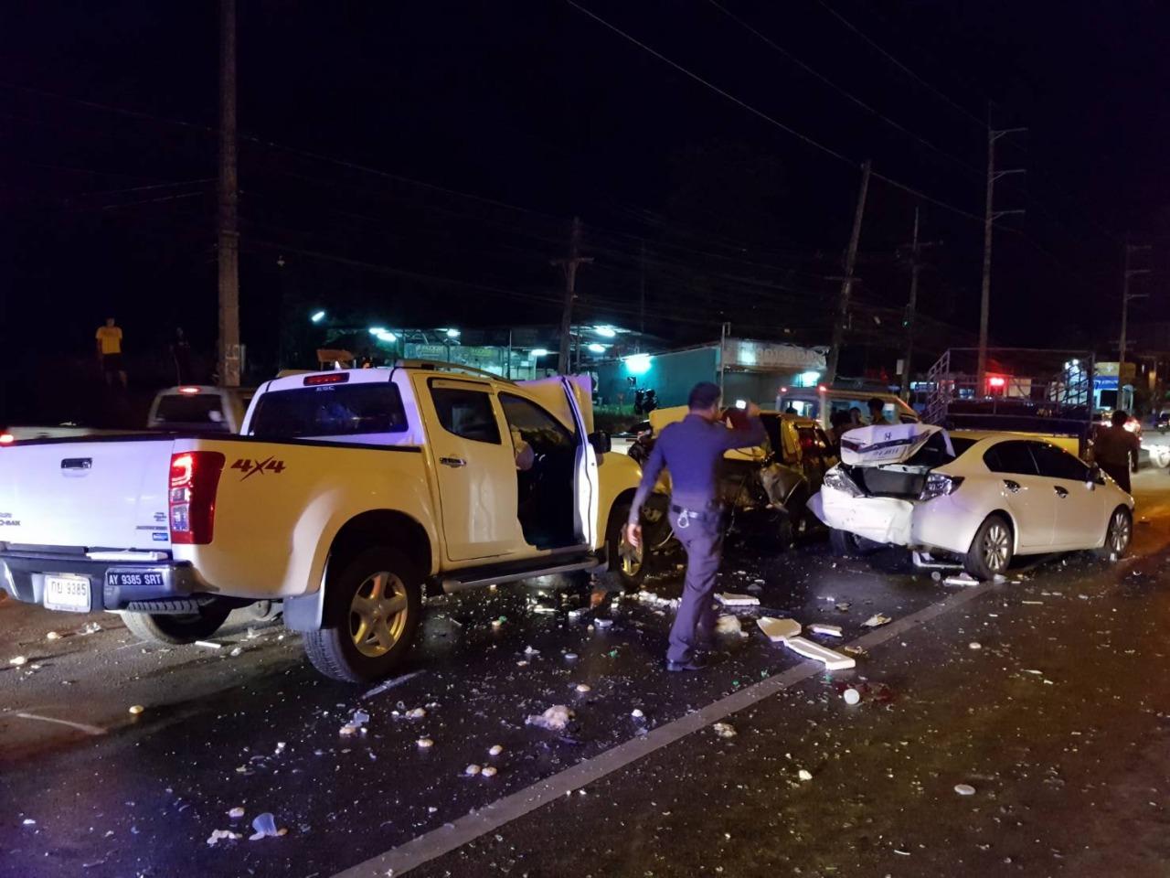 สอบสวนทราบว่า ก่อนเกิดเหตุรถทั้ง 7 คัน ตามหลังกันมาโดยมีรถกระบะยี่ห้อ อีซูซุ สีขาว ทะเบียน กย9385 สุราษฏร์ธานี ขับตามหลังมาด้วยความเร็ว แล้วพุ่งชนรถที่จอดติดสัญญาณไฟแดง ทำให้ทั้ง 6 คันพุ่งไปชนคันด้านหน้าด้วยความแรง ทำให้รถเสียหายอย่างหนัก และมีผู้บาดเจ็บดังกล่าว ซึ่งทางเจ้าหน้าที่จะได้สอบสวนอีกครั้งหนึ่ง.