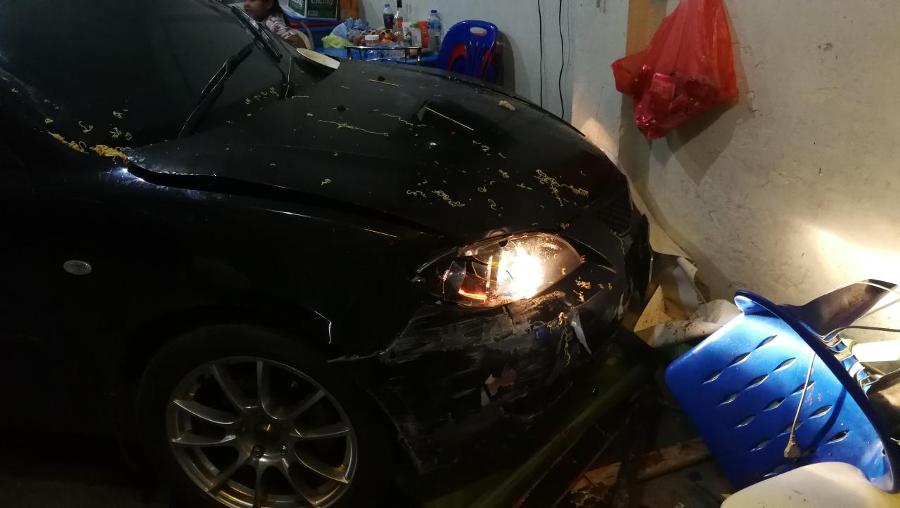 จากการสอบสวนทราบว่า ขณะเกิดเหตุรถเก๋งคันนี้ซึ่งขับมาค่อนข้างเร็ว แต่เมื่อมาถึงตรงสี่แยกได้ถูกรถจักรยานยนต์สามล้อพ่วงข้าง ที่กำลังขับผ่านสี่แยกเช่นกันพุ่งชนตรงประตูหลังข้างซ้าย ทำให้รถเก๋งเสียการควบคุมพุ่งเข้าไปในร้าน ที่อยู่ตรงหัวมุมสี่แยกชนดะทั้งรถจักรยานยนต์ ลูกค้าที่นั่งอยู่หน้าร้าน 2 คน และเข้าไปจอดสงบนิ่งอยู่ภายในร้าน ท่ามกลางความตกใจของทั้งเจ้าของร้าน และลูกค้ารวมทั้งผู้คนในบริเวณดังกล่าวเนื่องจากอยู่ใจกลางเมือง ทั้งนี้ตำรวจจะสอบสวนคู่กรณีทั้งสองฝ่ายอีกครั้งหนึ่งว่ามาจากความประมาทของฝ่ายใดและใครเป็นคนฝ่าไฟแดง.
