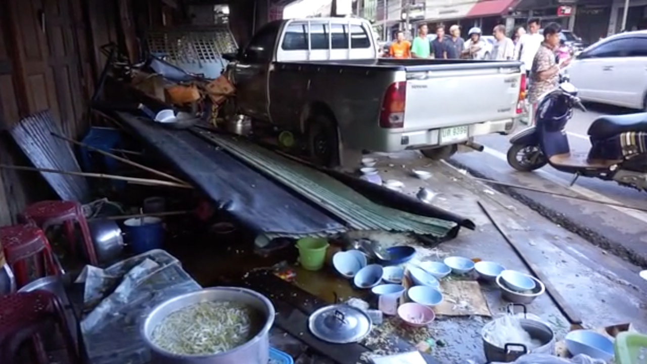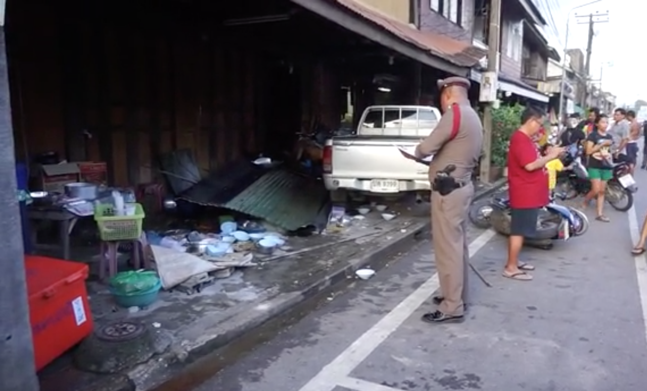 หนุ่มใหญ่ลูกค้าประจำ ขับกระบะจะมาซื้อผัดไทย ใกล้ถึงร้าน หยิบยาใส่ปาก ยาดันติดคอ ขณะที่เท้าก็เหยียบคันเร่ง ทำให้รถเสียหลักพุ่งชนร้านผัดไทย แม่ค้ากับลูกค้าเจ็บ 2 ...