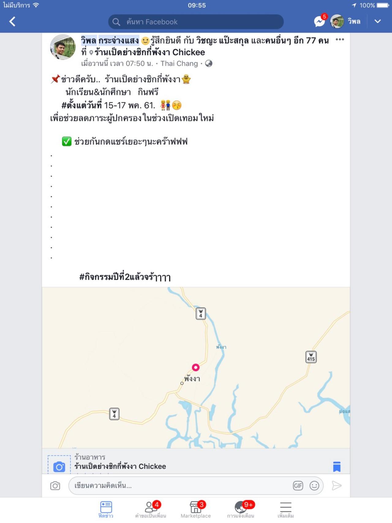 เมื่อวันที่ 16 พ.ค.61 ผู้สื่อข่าวรายงานว่า นายวิพล กระจ่างแสง เจ้าของร้านเป็ดย่างชิคกี้ เยื้องโรงพยาบาลพังงา เขตเทศบาลเมืองพังงา โพสต์ข้อความผ่านเฟซบุ๊กส่วนตัว เชิญชวนนักเรียน นักศึกษา เข้ารับประทานอาหารภายในร้านฟรี ระหว่างวันที่ 15-17 พฤษภาคม 2561 นี้ ตั้งแต่เวลา 07.00 – 15.00 น. เพื่อลดภาระต้นทุนของผู้ปกครองในช่วงวันเปิดเทอมปีการศึกษา 2561