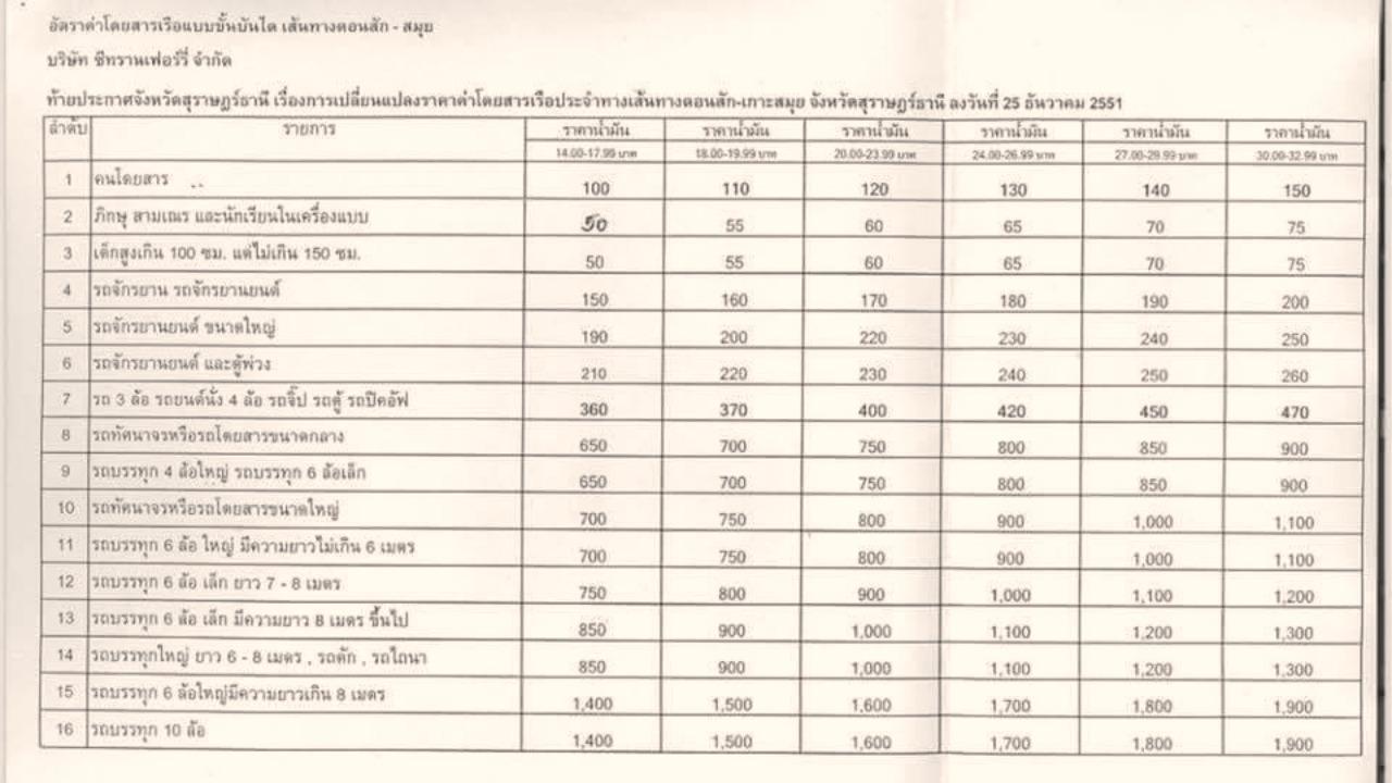 ผู้สื่อข่าวรายงานว่า สำหรับอัตราค่าโดยสารที่ปรับขึ้นนั้น เฉลี่ยตั้ง 5-200 บาท โดยค่าคนโดยสารในเส้นทางดอนสัก-เกาะสมุย-ดอนสัก จากเดิม 140 บาท ปรับเป็น 150 บาท ค่ารถบรรทุก10 ล้อ บรรทุกยาวเกิน 1 เมตร จากเดิม 2,200 บาท เพิ่มเป็น 2,400 บาท ,รถบรรทุก 6 ล้อใหญ่ ความยาวไม่เกิน 6 เมตร จากเดิม 1,000 บาท เป็น 1,100 บาท.