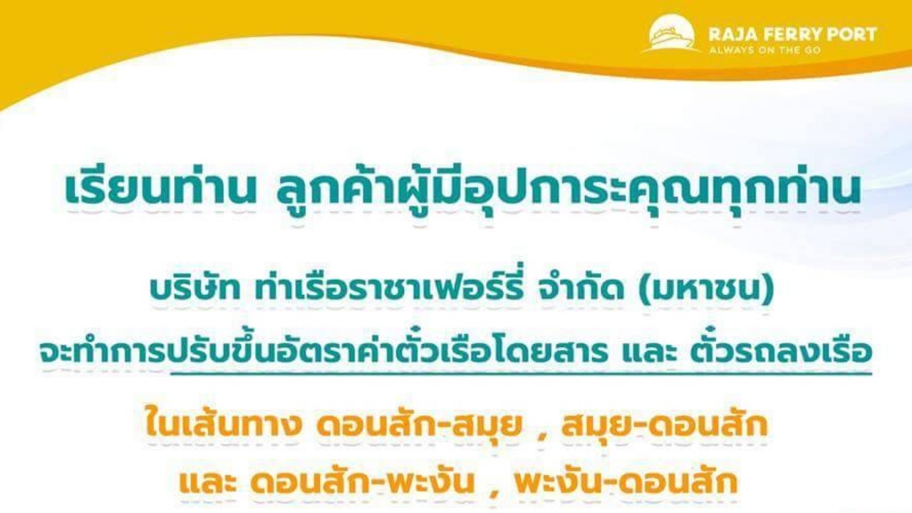 "เรียน ท่านลูกค้าผู้มีอุปการะคุณบริษัท ท่าเรือราชาเฟอร์รี่ จำกัด (มหาชน) ได้ทำการปรับขึ้นอัตราค่าตั๋วโดยสาร ทั้งตั๋วผู้โดยสารและตั๋วรถลงเรือ ในเส้นทาง ดอนสัก-สมุย-ดอนสักและ ดอนสัก-พะงัน-ดอนสัก ทั้งนี้เพื่อให้สอดคล้องกับราคาน้ำมันที่ปรับตัวเพิ่มสูงขึ้นเกิน 30.00 บาท/ต่อลิตร ซึ่งเป็นไปตามประกาศของจังหวัดสุราษฎร์ธานี"