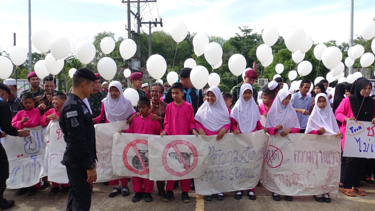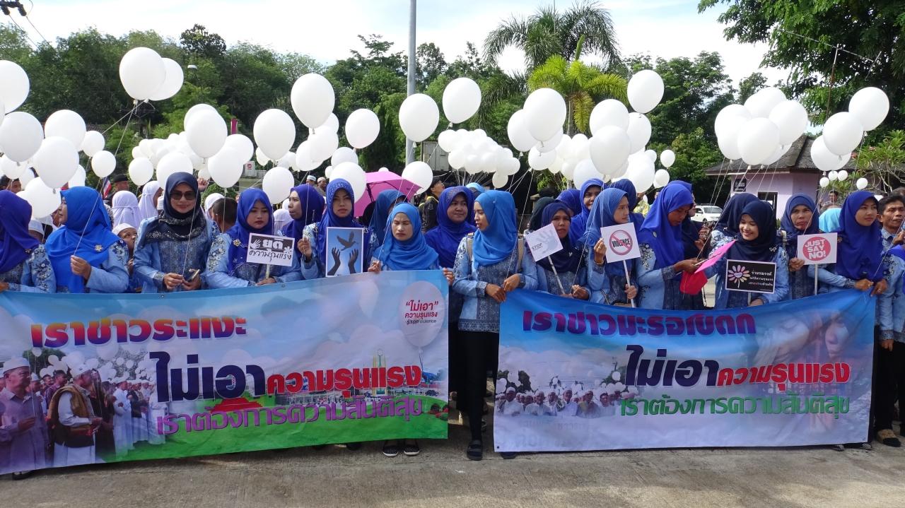 ทั้งนี้กลุ่มพลังมวลชน ได้ร่วมกัน ถือลูกโป่งสีขาว และถือป้ายข้อความภาษาไทย อาทิ "รวมพลังชาวระแงะต่อต้านความรุนแรง" "ไม่เอาความรุนแรง" "ยุติความรุนแรง คืนสันติสุขให้แก่สังคม" และข้อความ "พหุวัฒนธรรมคือความหลากหลาย การอยู่ร่วมกัน ปฏิเสธความรุนแรงทุกรูปแบบ"