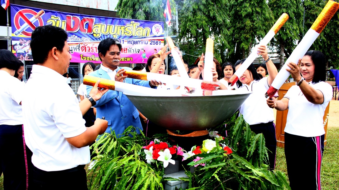 เมื่อวันที่ 31 พ.ค. 61 โรงเรียนอนุบาลยะลา อ.เมือง จ.ยะลา ซึ่งเป็นโรงเรียนในโครงการโรงเรียนสีขาว ห่างไกลยาเสพติด นักเรียนระดับชั้นอนุบาล ถึง ชั้นประถมศึกษาปีที่ 6 พร้อมใจใส่เสื้อสีขาว ร่วมกิจกรรมออกกำลังกายรณรงค์ต่อต้านการสูบบุหรี่ โดยมี นายสมคิด สมพงษ์ ผอ.โรงเรียนอนุบาลยะลา ประธานกล่าวเปิดกิจกรรม โดยการนำมวนบุหรี่ยักษ์ที่มีการจำลองขึ้นมา จำนวน 10 มวน จุดไฟเผาทำลาย จากนั้นได้นำนักเรียนครูและบุคลากร จำนวน 1,200 คน ร่วมออกกำลังกาย แสดงพลังต่อต้านการสูบบุหรี่ เนื่องในวันงดสูบบุหรี่โลก โดยคำขวัญในปีนี้คือ “บุหรี่ตัวร้าย ทำลายหัวใจ (Tobacco Break Heart)”