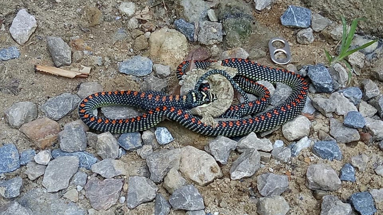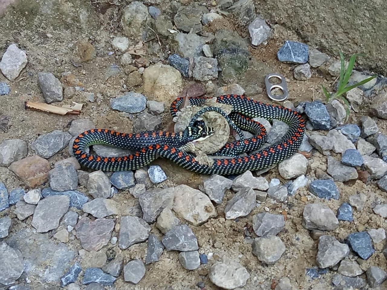 เมื่อวันที่ 25 มิ.ย.2561 ผู้สื่อข่าวรายงานว่า จากภาพที่นายณัฐชนน อยู่บำรุง เจ้าหน้าที่อุทยานแห่งชาติหาดนพรัตน์ธารา-หมู่เกาะพีพี จ.กระบี่ ได้บันทึกภาพขณะที่งูเขียวร่อน หรืองูเขียวดอกหมากขนาดยาวประมาณ 1 เมตร กินตุ๊กแกบิน หรือตุ๊กแกป่า ภายในป่าบริเวณทางขึ้นเขาหงอนนาค ซึ่งอยู่ในเขตอุทยาน ข้างหน่วยพิทักษ์อุทยานแห่งชาติที่ พพ.4 ทับแขก ต.หนองทะเล อ.เมืองกระบี่ ซึ่งงูหลังจับตุ๊กแกมาได้ ก็พยายามกลืนลงท้องใช้เวลาประมาณ 5 นาที จึงกลืนลงไปได้ทั้งตัวก่อนเลื้อยเข้าป่าลึกไป