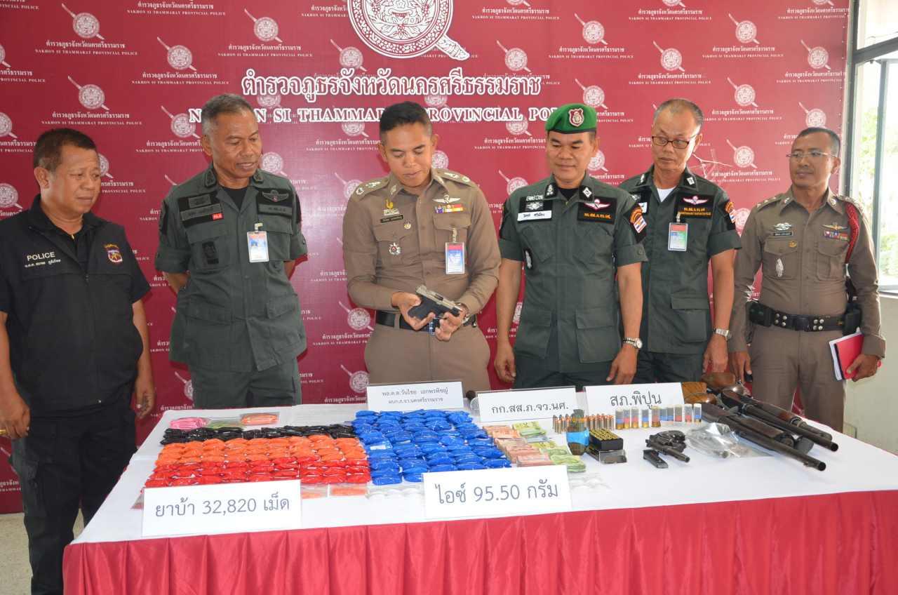 จากการเข้าเคลียร์พื้นที่ภายในกระท่อม พบยาบ้า 32,820 เม็ด, ยาไอซ์หนักรวม 95.50 กรัม, อาวุธปืนลูกซองยาว 2 กระบอก, อาวุธปืนพกสั้นอีก 3 กระบอกและกระสุนชนิดต่างๆ รวม 90 นัดเงินสด 4.5 หมื่นบาท ซึ่งภายในกระท่อมมีนางกานดาหรือแขก ศรีแบ่ง อายุ 16 ปี เมียของนายจ่านันท์หรืออึ้ง เขาพระ และนาย ส.หิรัญ ธานิทร์พงศ์ อายุ 30 ปี ส่วนผู้ต้องหาที่หลบหนีไปได้คือนายจ่านันท์ สงเคราะห์ อายุ 43 ปี หัวหน้าแก๊งยานรกรายใหญ่ในพื้นที่
