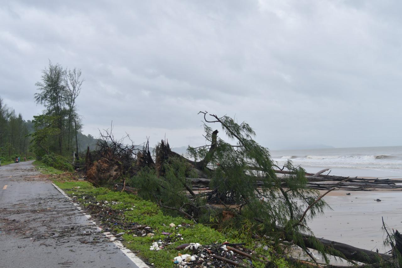 หัวหน้าสถานีวิจัยเพื่อการพัฒนาชายฝั่งอันดามันฯ ม.เกษตรศาสตร์ กล่าวด้วยว่า นอกจากนี้ คลื่นทะเลได้กัดเซาะเข้าไปใต้ถนนเลียบชายหาดบริเวณทางเข้าสถานีวิจัยลึกประมาณ 1 ถึง 2 เมตรด้วย อีกทั้งป้อมยามก็โดนคลื่นกัดเซาะพังทลายลงไปในทะเลด้วย โดยสถานการณ์ล่าสุด เจ้าหน้าที่ได้มีการล้มต้นสนที่มีความเสี่ยงและอยู่ในสภาวะที่ไม่แข็งแรงให้ลงมาก่อน ก่อนที่จะล้มลงมาเองและสร้างความเสียหายมากยิ่งขึ้น ซึ่งในขณะนี้มีเหลืออยู่แค่เพียง 5 ต้น แต่ต้องล้มออกทั้งหมดเพราะน้ำได้กัดเซาะเข้ามาถึงใต้โคนต้นและถนนแล้ว.
