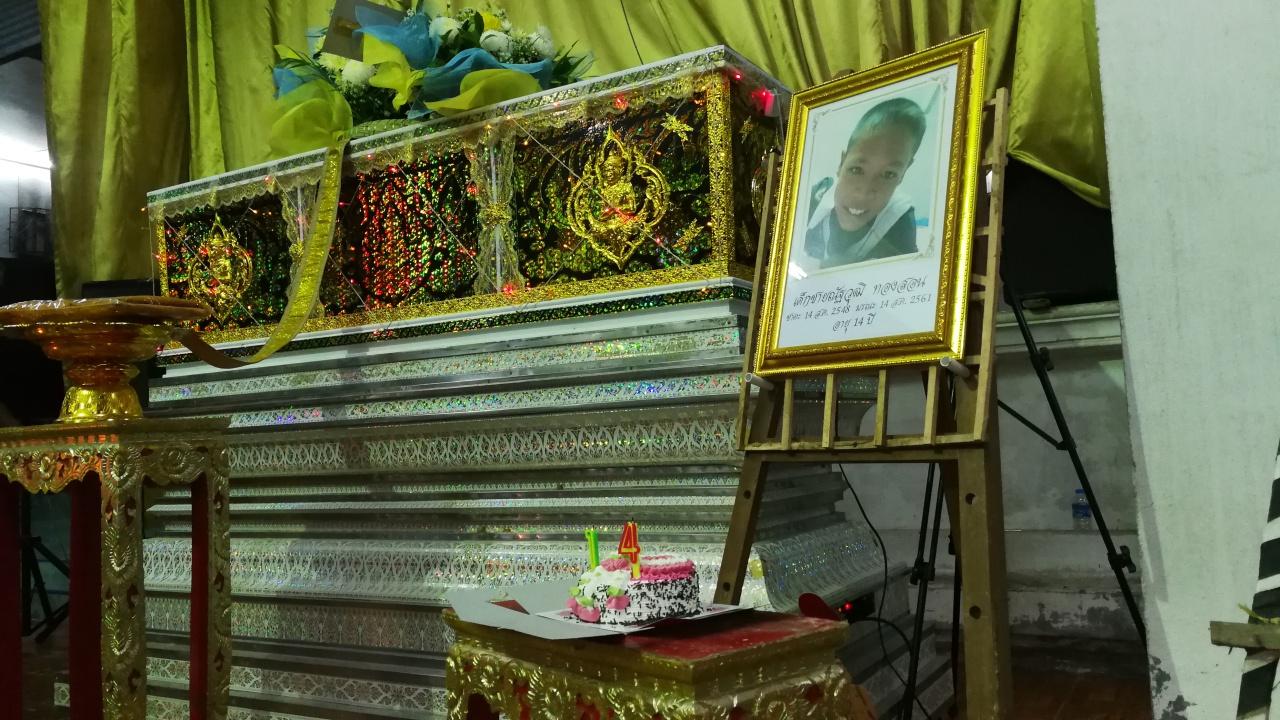 เมื่อเวลา 18.00 น. วันนี้ (14 ส.ค.) ญาติได้เคลื่อนศพน้องโก้ ออกจากโรงพยาบาลหาดใหญ่มาทำพิธีรดน้ำศพที่วัดควนลัง อ.หาดใหญ่ จ.สงขลา และจะตั้งบำเพ็ญกุศลศพเป็นเวลา 7 วันก่อนที่จะมีพิธีฌาปนกิจในวันจันทร์ที่ 20 สิงหาคมนี้ ซึ่งบรรยากาศในพิธีรดน้ำศพเป็นไปด้วยความโศกเศร้าของพ่อแม่และญาติพี่น้อง โดยมีคณะครูและเพื่อนนักเรียนมาร่วมในพิธีรดน้ำศพด้วย เพื่อร่วมกันไว้อาลัยเป็นครั้งสุดท้าย