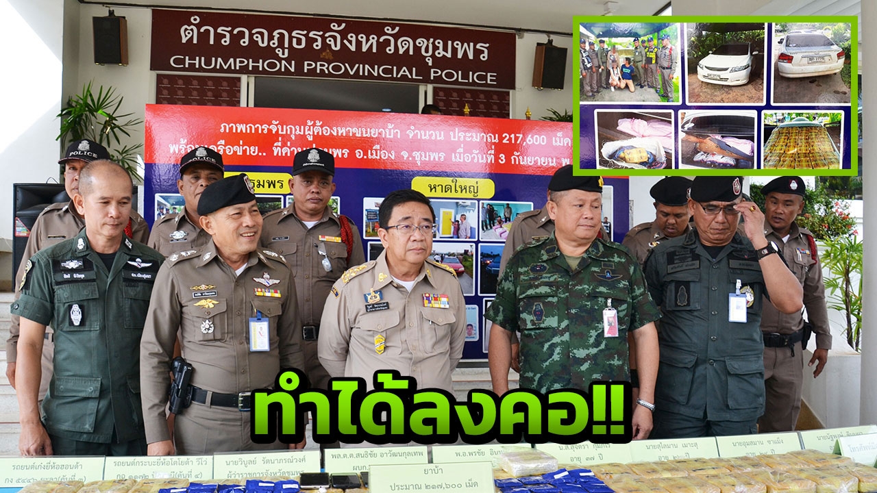 เมื่อเวลา 09.00 น. วันที่ 6 ก.ย. 61 นายวิบูลย์ รัตนาภรณ์วงศ์ ผู้ว่าราชการจังหวัดชุมพร พล.ต.ต.สนธิชัย อาวัฒนกุลเทพ ผบก.ภ.จ.ชุมพร พ.ต.อ.เสริมศักดิ์ พ่วงพิศ ผกก.สส.ภ.จ.ชุมพร พ.ต.อ.ธงชัย นุ้ยเจริญ ผกก.สภ.เมืองชุมพร ร่วมกันแถลงผลการจับกุมผู้ต้องหาค้ายาเสพติด 4 ราย มีผู้ต้องหาที่ 1. นายนัฐพงษ์ ดีบุบผา อายุ 39 ปี อยู่บ้านเลขที่ 131 หมู่ที่ 1 ตำบลศรีแก้ว อ.เลิงนกทา จ.ยโสธร 2. นางสาวสุจิตรา กุมภิโร อายุ 37 ปี อยู่บ้านเลขที่ 58 หมู่ที่ 6 ตำบลนาโสก อ.เมือง จ.มุกดาหาร 3. นายสุไลมาน เมาะสุ อายุ 26 ปี อยู่บ้านเลขที่ 300 หมู่ที่ 4 ตำบลสำนักท้อน อ.บ้านฉาง จ.ระยอง 4. นายอุมสมาน ซาแม็ง อายุ 29 ปี อยู่บ้านเลขที่ 16 หมู่ที่ 4 ตำบลสาคอใต้ อ.มายอ จ.ปัตตานี พร้อมของกลางยาบ้า 217,600 เม็ด มูลค่ากว่า 43 ล้านบาท รถเก๋งยี่ห้อฮอนด้า รุ่นซิตี้ สีขาว ทะเบียน ญถ 2775 กรุงเทพมหานคร รถเก๋งยี่ห้อฮอนด้า รุ่นแจ๊ซ สีขาว ทะเบียน สฎ 9666 กรุงเทพมหานคร รถเก๋งยี่ห้อฮอนด้า รุ่นซิตี้ สีแดง ทะเบียน กง 5446 ยะลา รถยนต์กระบะยี่ห้อโตโยต้า รีโว่ ชนิด 4 ประตู สีดำ ทะเบียน กฉ 1172 ปัตตานี โทรศัพท์มือถือ 5 เครื่อง และของกลางอื่นๆ อีกหลายรายการ โดยกล่าวหาว่าร่วมกันมียาเสพติดให้โทษประเภทที่ 1 (ยาบ้า) ไว้ในครอบครองเพื่อจำหน่าย โดยผิดกฎหมาย