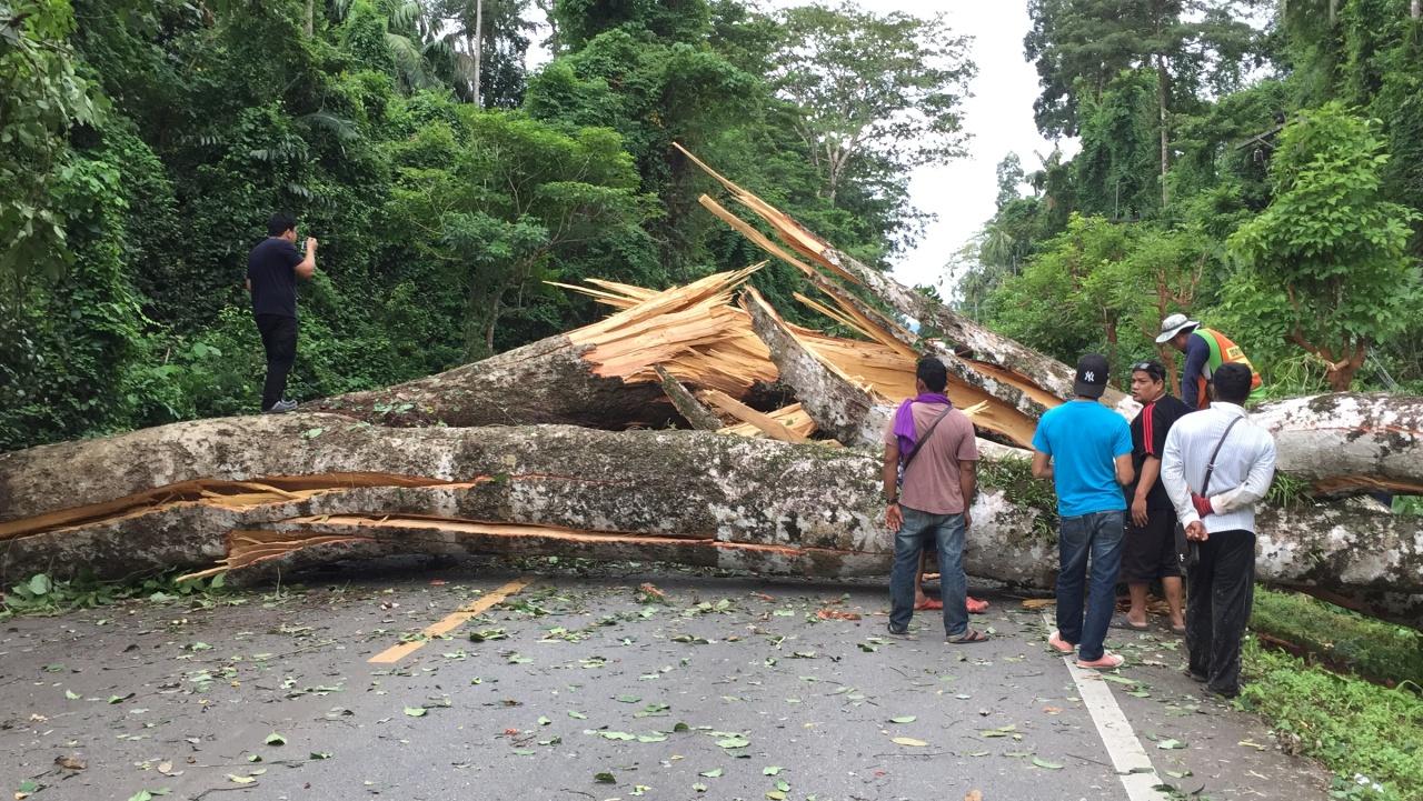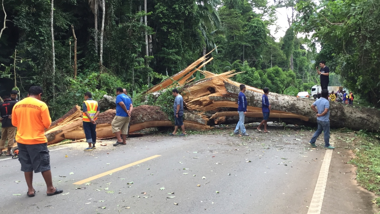 เมื่อเวลา 16.00 น. วันที่ 8 ก.ย. 61 ศูนย์วิทยุ สภ.อ่าวนาง จ.กระบี่ รับแจ้งจากผู้ใช้เส้นทางหลวงหมายเลข 4033 บ้านในสระ-เขาทอง หมู่ 1 ต.เขาทอง อ.เมืองกระบี่ ว่า มีต้นไม้ขนาดใหญ่ถูกลมกระโชกแรงพัดล้มลงมาทั้งต้น ขวางถนนทั้ง 2 ช่องทาง ทำให้รถไม่สามารถสัญจรได้ จึงประสานไปยังแขวงทางหลวง จ.กระบี่ เจ้าหน้าที่กู้ภัยมูลนิธิกระบี่พิทักษ์ประชา รุดไปตรวจสอบ