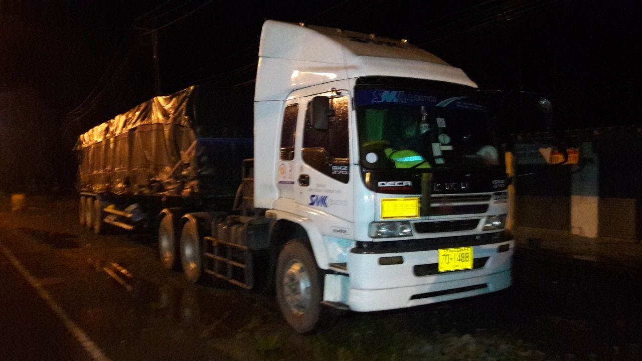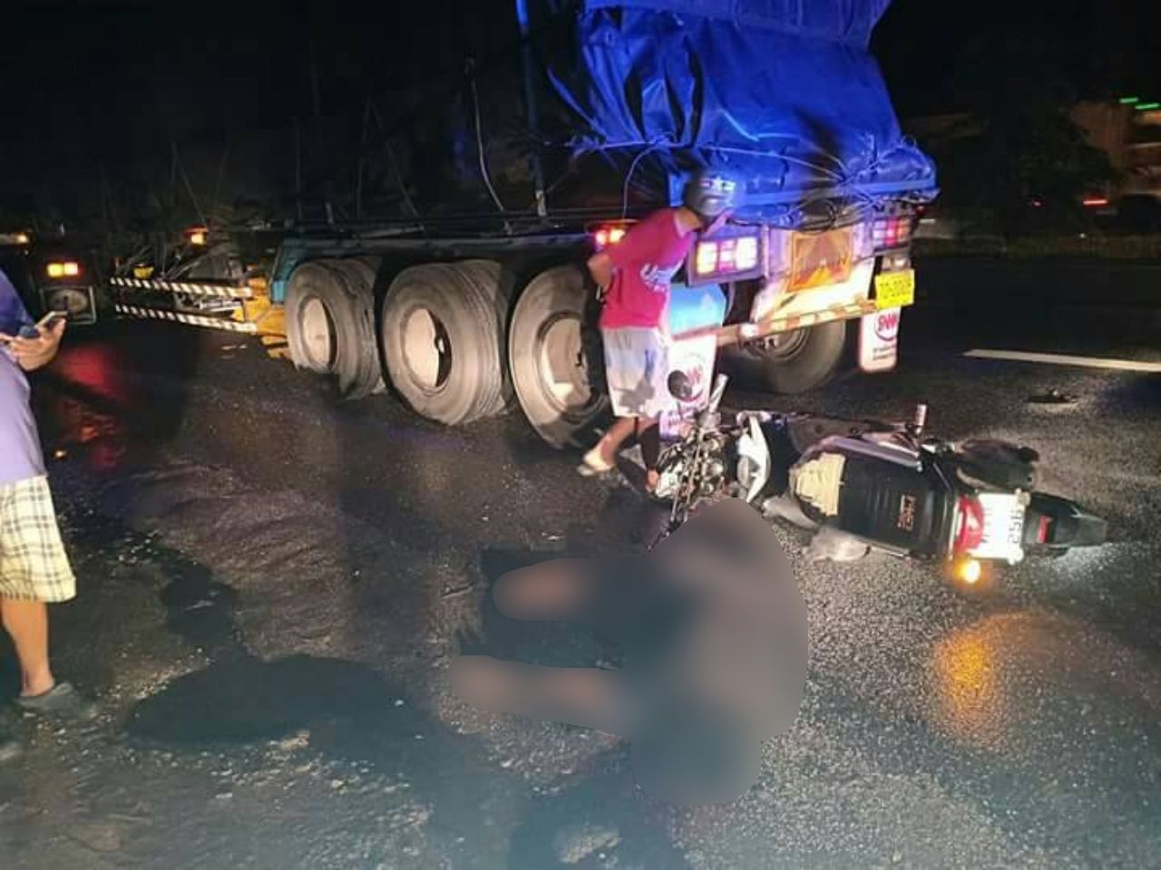 ที่เกิดเหตุพบรถพ่วง 22 ล้อ ยี่ห้ออีซูซุ สีขาว ทะเบียนตอนหน้า 70-1488 ชุมพร ทะเบียนตอนท้าย 70-2005 ชุมพร กระจกหน้ารถติดสติกเกอร์ “บริษัท ศิริมงคล โลจิสติกส์ จำกัด” จอดอยู่ข้างทางเปิดสัญญาณไฟฉุกเฉิน ท้ายรถมีรอยถูกชนจนเหล็กยุบไปเล็กน้อย ใกล้กันพบรถจักรยานยนต์ฮอนด้าซูโม่เอ็กซ์ สีขาวดำ ทะเบียน ครบ 256 นครศรีธรรมราช ล้มคว่ำอยู่ท้ายรถพ่วง มีนายสมบูรณ์ กามุณี อายุ 51 ปี อยู่บ้านเลขที่ 163/1 หมู่ 3 ต.ถ้ำพรรณรา ช่างก่อสร้างผู้ขับขี่รถจักรยานยนต์นอนคว่ำหน้าจมกองเลือดเสียชีวิตในที่เกิดเหตุ ส่วนนายสุธน บัวขำ อายุ 35 ปี อยู่บ้านเลขที่ 87/2 หมู่ 3 ต.แก่งโสภา อ.วังทองจ.พิษณุโลก โชเฟอร์รถพ่วงเดินเข้าไปมอบตัวกับเจ้าหน้าที่ภายในป้อมสายตรวจที่อยู่ใกล้จุดเกิดเหตุ