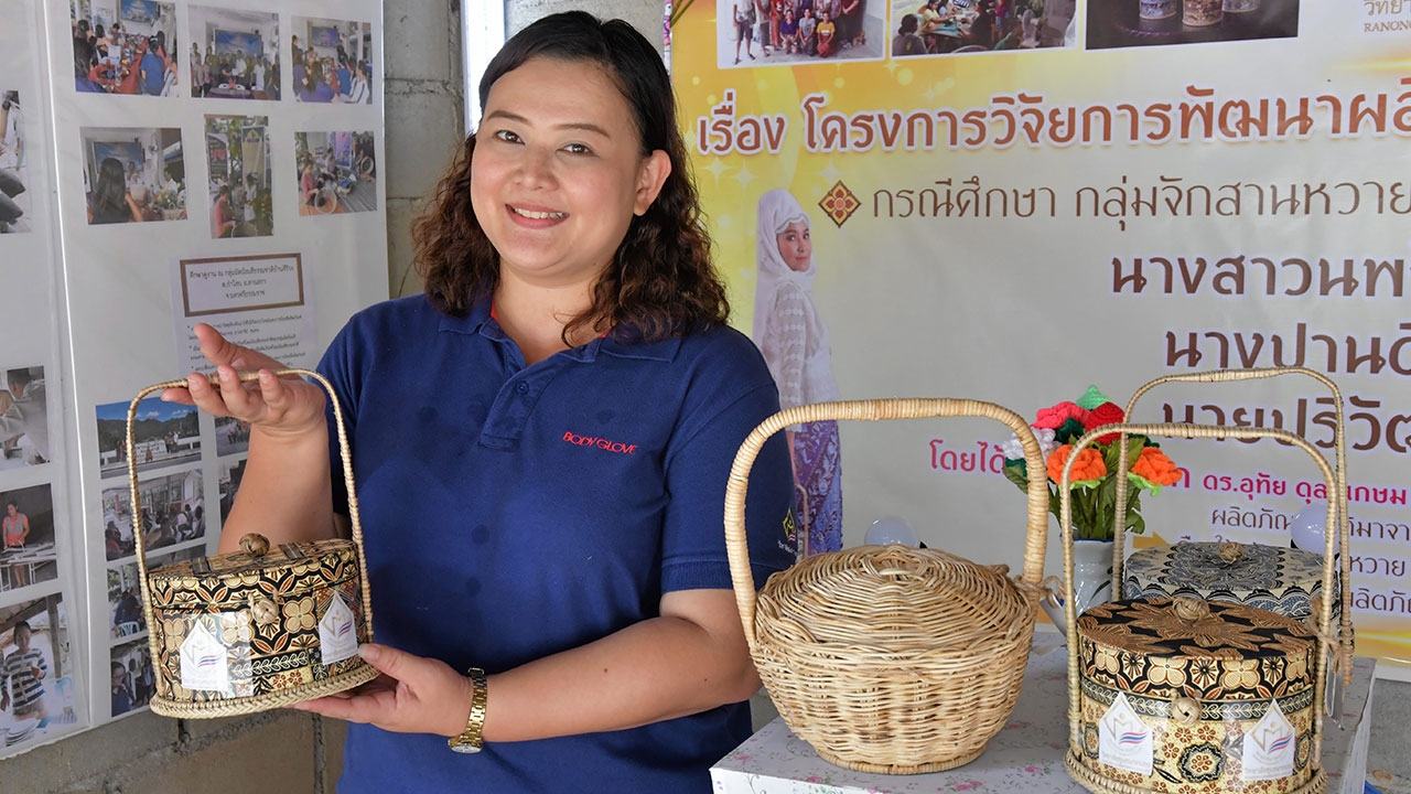 แต่ยังยึดติดอยู่กับรูปแบบเดิมๆ จึงเข้าไปให้ความรู้ เพื่อช่วยยกระดับผลิตภัณฑ์ ให้มีมูลค่ายิ่งขึ้น ที่สำคัญยังเน้นการใช้หวายให้น้อยลง แต่นำวัสดุที่มีอยู่ในพื้นที่ จ.ระนอง ใช้ประกอบเสริมทำเป็นชิ้นงาน เช่น ผ้าปาเต๊ะ