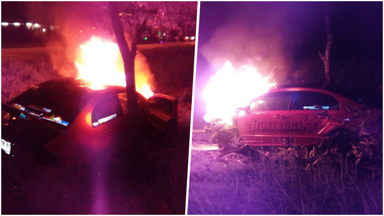 หวิดโดนย่างสด หนุ่มซิ่งเก๋งจากเมืองคอน จำทางไม่ได้ขับเลยเสียหลัก ตกข้างทางเกาะกลางถนน พุ่งชนต้นไม้ ไฟลุกท่วม เดชะบุญ ชาวบ้านช่วยงัดนำร่างออกมาได้ทัน ก่อนถูกไฟเผา