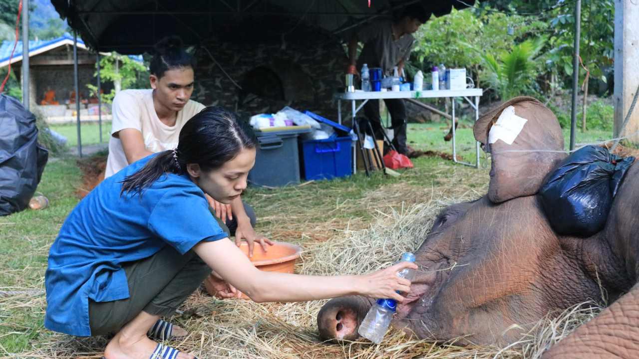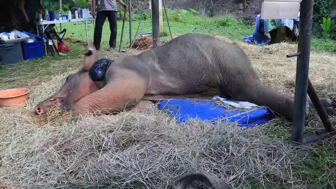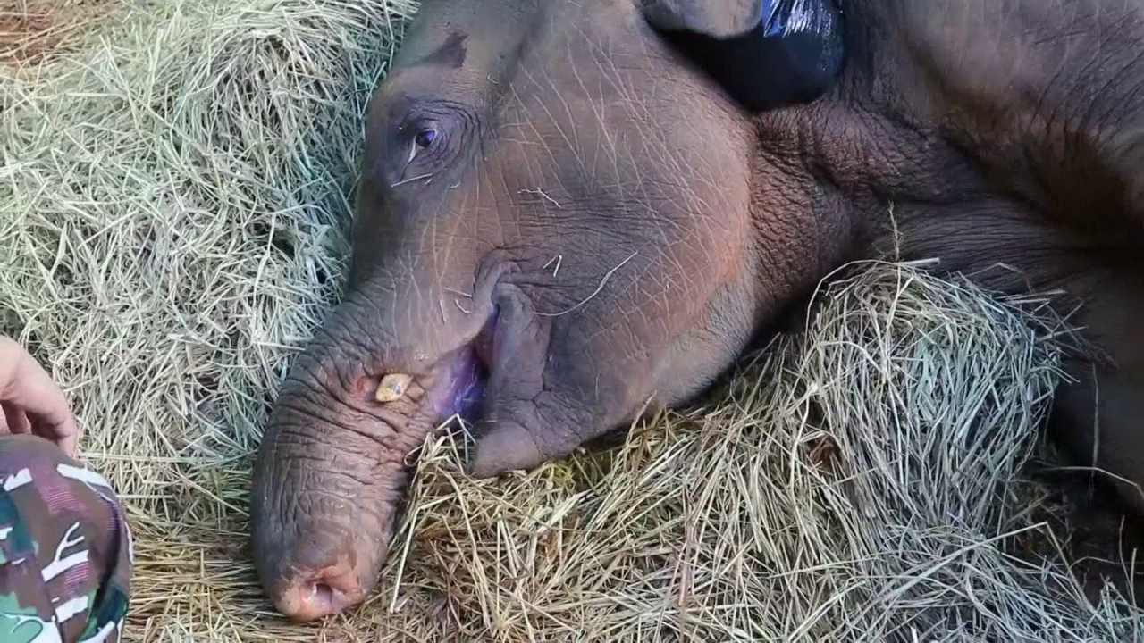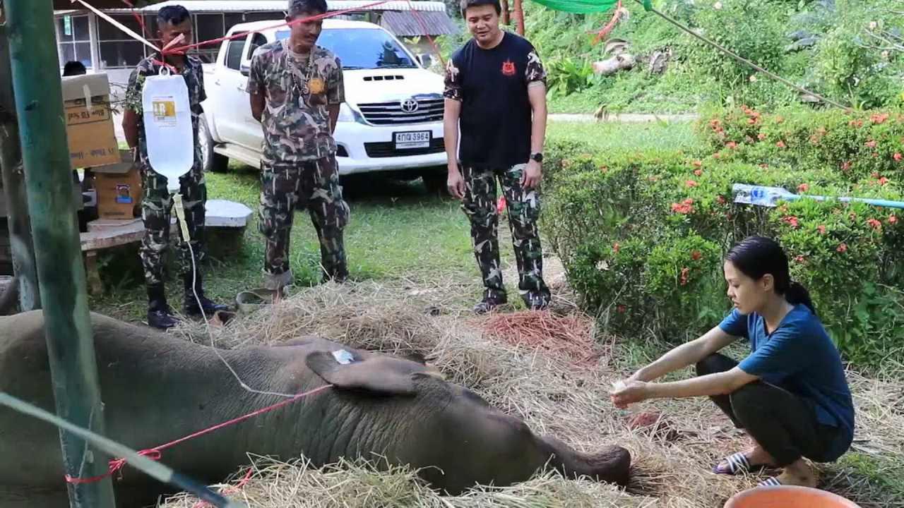 สัตวแพทย์ ต้องให้น้ำเกลือ ดูแลใกล้ชิด ‘เจ้าด้วน’ ลูกช้างป่าเพศผู้ กลิ้งจากเขาสูง จมบ่อน้ำในป่าทุ่มตะโก จ.ชุมพร รอเคลื่อนย้ายไปรพ.ช้าง จ.กระบี่ คาดงวงที่สั้นกุด ทำให้ยึดเหนี่ยวกิ่งไม้ไม่ได้ จนพลัดตกมา