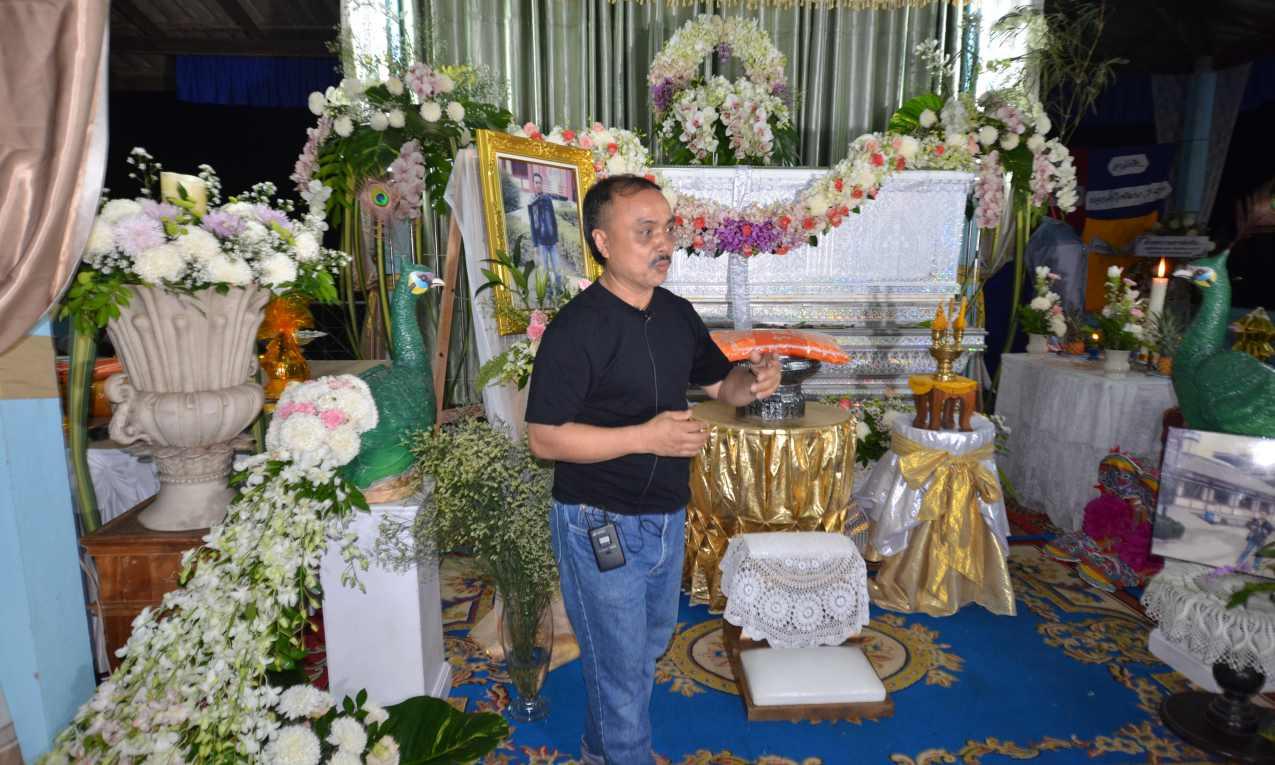 ส่วนบรรยากาศหน้าโลงศพ ดอกไม้ที่จัด เน้นดอกไม้ที่มีสีสันที่เหมาะกับวัยของคนวัย 50 ปี ใช้ชื่อว่า “คืนชีวิตสู่สวรรค์” หมายถึงว่าเราได้น้องชายมาจากสวรรค์เพราะเขาเป็นคนดีเหลือเกิน แล้วก็ลิขิตของสวรรค์นั้นได้นำน้องชายเรากลับไป การตกแต่งตรงนี้ Concept ของเราก็คือว่า เป็นมวลของปุยเป็นมวลแห่งสวรรค์ และเป็นดอกไม้ทุกอย่างนั้นเป็นดอกไม้ที่ถูกสร้างขึ้นมาให้สอดคล้องมีความหมายไล่สีจากเข้มไปอ่อนและข้างบนนั้นมีมาลัยคล้องมือ เพื่อบ่งบอกว่าสวรรค์รับรู้และรับตัวน้องชายไป เราขมขื่นเหลือเกินที่ต้องจากน้องไป แต่เราหวังว่าน้องชายนั้นกลับสู่สวรรค์ จึงสร้างบรรยากาศทุกอย่างให้เหมือนดอกไม้บนสวรรค์ มีนกสองตัว นกที่อยู่บนสวรรค์ นั่นก็คือนกยูง
