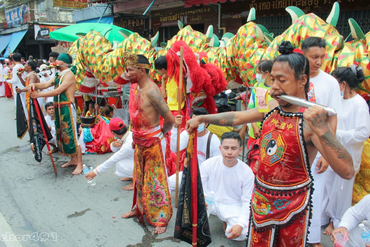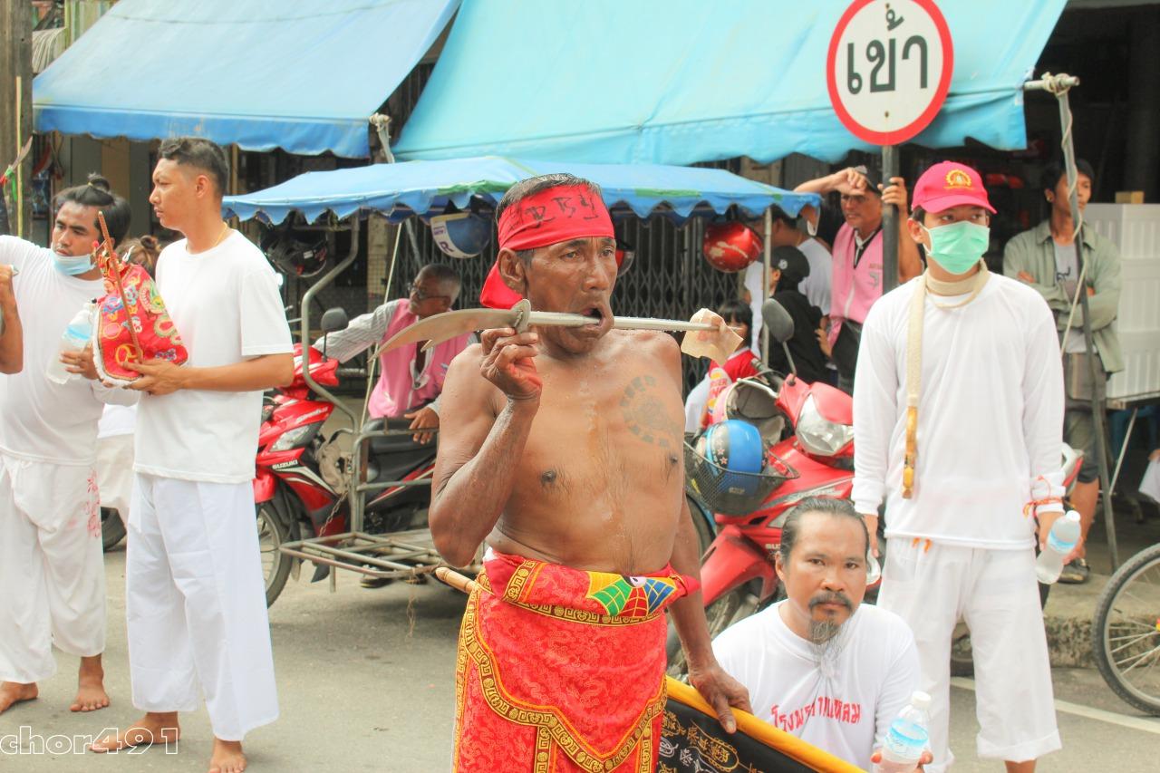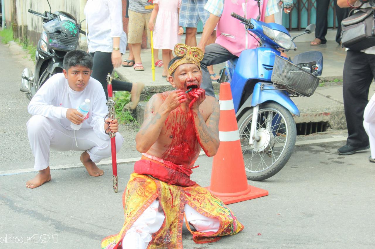 ส่วนหนึ่งม้าทรงแต่ละศาลเจ้าต่างก็แสดงอิทธิฤทธิ์กันอย่างเต็มที่ ม้าทรงบางคนก็ใช้เหล็กแหลมแทงตามใบหน้า ใช้มีดดาบฟาดฟันตัวเองเลือดอาบท่วมตัว มีทั้งเหล็กแหลมทิ่มแทงปาก ซึ่งตามประเพณีโบราณเชื่อกันว่าเป็นการสะเดาะเคราะห์ให้ผู้ถือศีลกินเจ โดยม้าทรงเป็นผู้รับเคราะห์กรรมแทน เพื่อเป็นการแผ่บารมี เมตตา เสริมดวงโชคชะตา ปัดเป่าสิ่งชั่วร้ายให้แก่ชาวจังหวัดระนอง และผู้มีจิตศรัทธาให้อยู่เย็นเป็นสุข ทำมาค้าขายมีกำไร สร้างความหวาดเสียวแก่ประชาชนและนักท่องเที่ยวเป็นอย่างมาก.